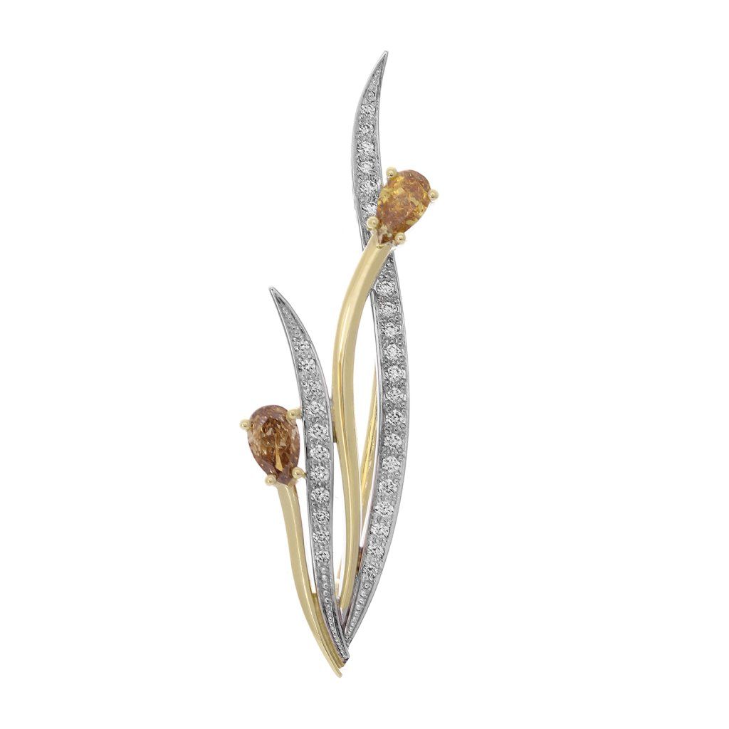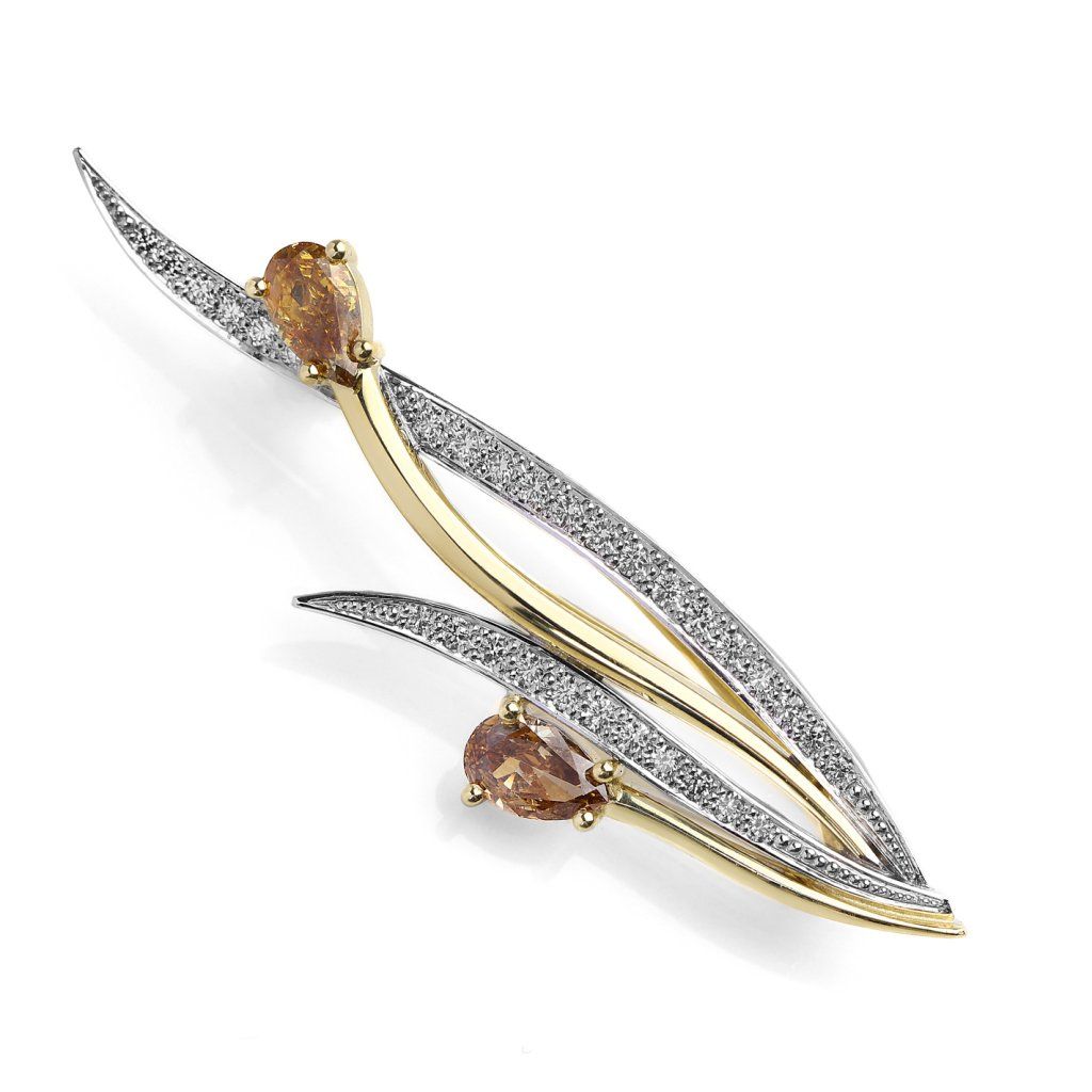 Tato zlatá brož představuje jemnou eleganci a sofistikovaný šperkařský design. Dominantou šperku jsou dva fancy–nahnědle žluté přírodní diamanty briliantového pantlokového brusu. První diamant o rozměrech 5,27x3,06x2,12 mm má hmotnost 0,25 ct, čistotu SI2 a je doložen certifikátem IGI č. 604308148.