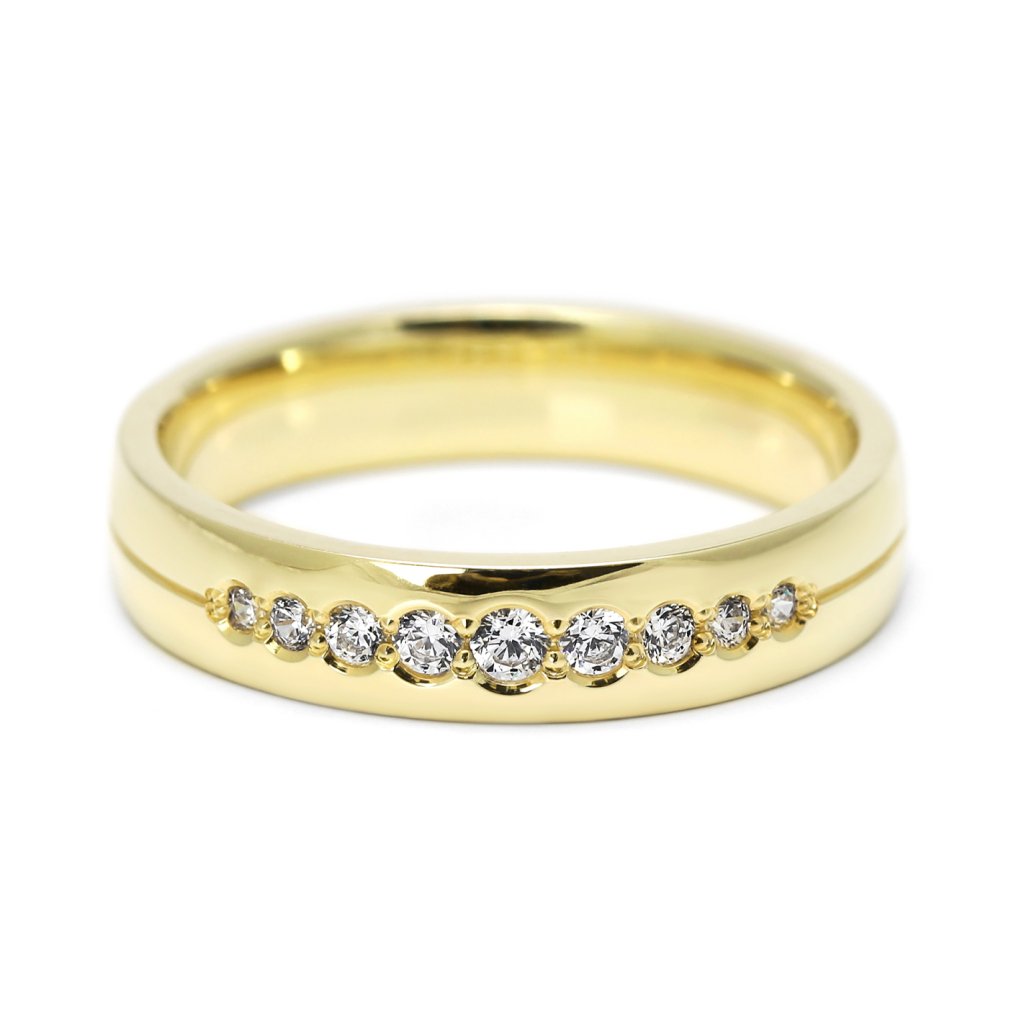 Dámský snubní prsten ze žlutého zlata s devíti diamanty v postupně gradujícím osazení. Elegantní, zářivý a luxusní šperk.