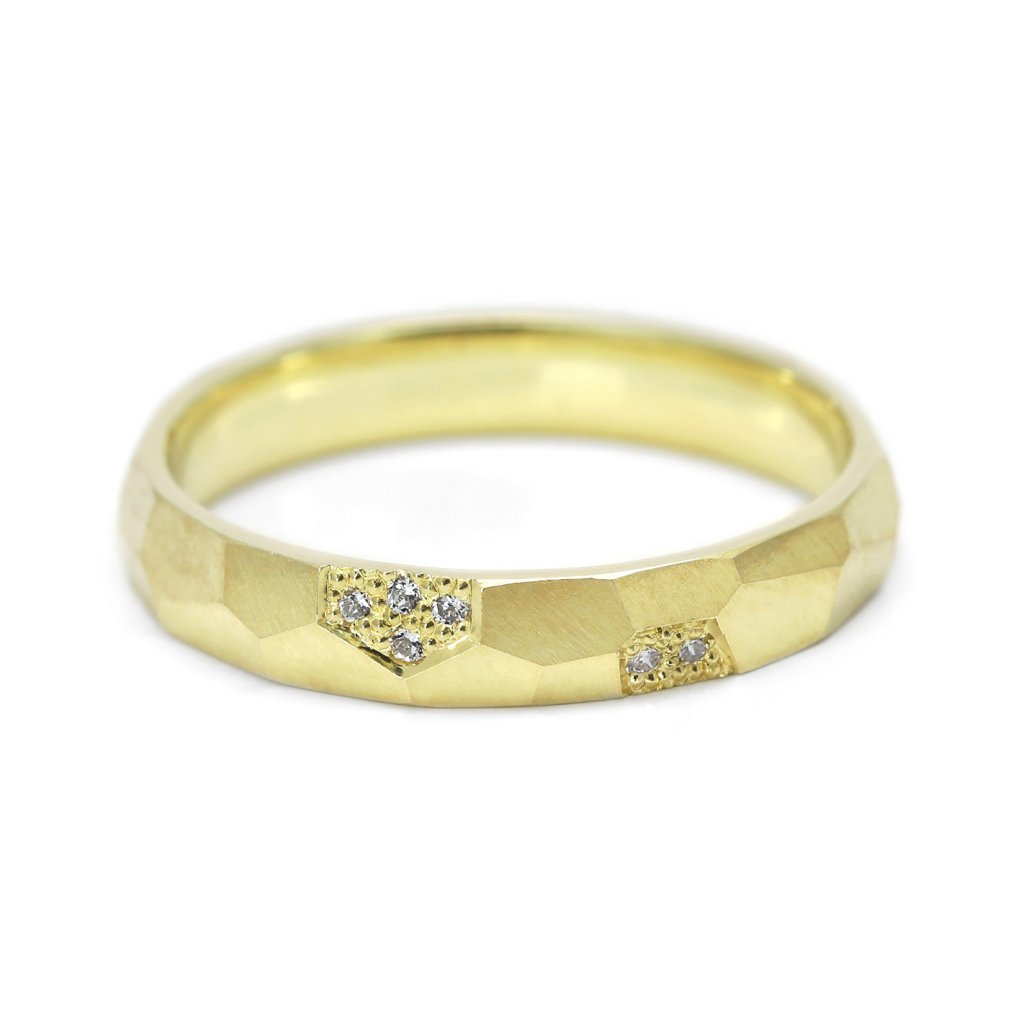 Dámský snubní prsten ze žlutého zlata s moderním facetovaným povrchem a deseti drobnými diamanty. Originální, jemně třpytivý a dokonale ženský šperk.