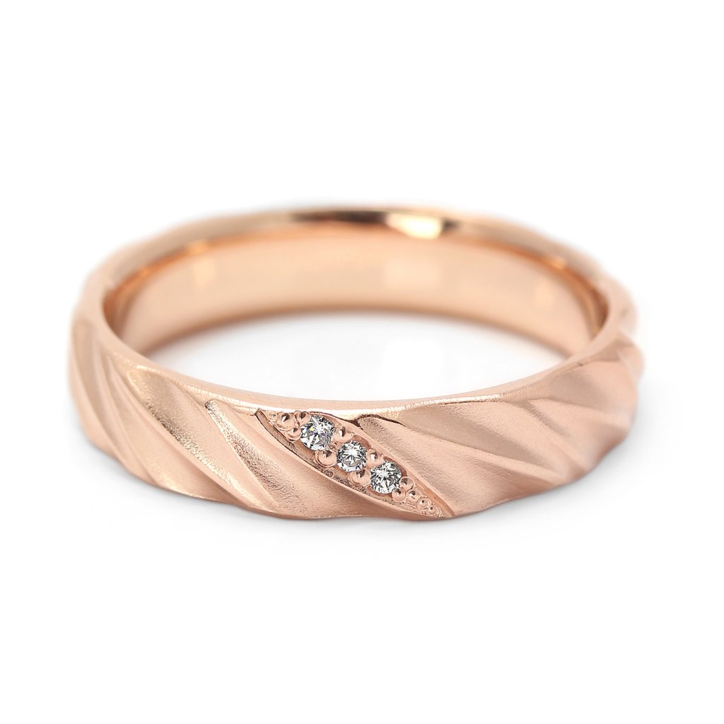 Tento dámský snubní prsten z růžového zlata je šperkem, který spojuje jemnost, originalitu a symboliku. Tři diamanty o velikosti 1,1–1,2 mm jsou zasazeny do elegantně tvarovaných výřezů, které připomínají vlnu nebo rytmus pohybu. Texturovaný povrch prstenu dodává šperku hloubku a vizuální dynamiku, zatímco teplý odstín růžového zlata podtrhuje romantický charakter celku.