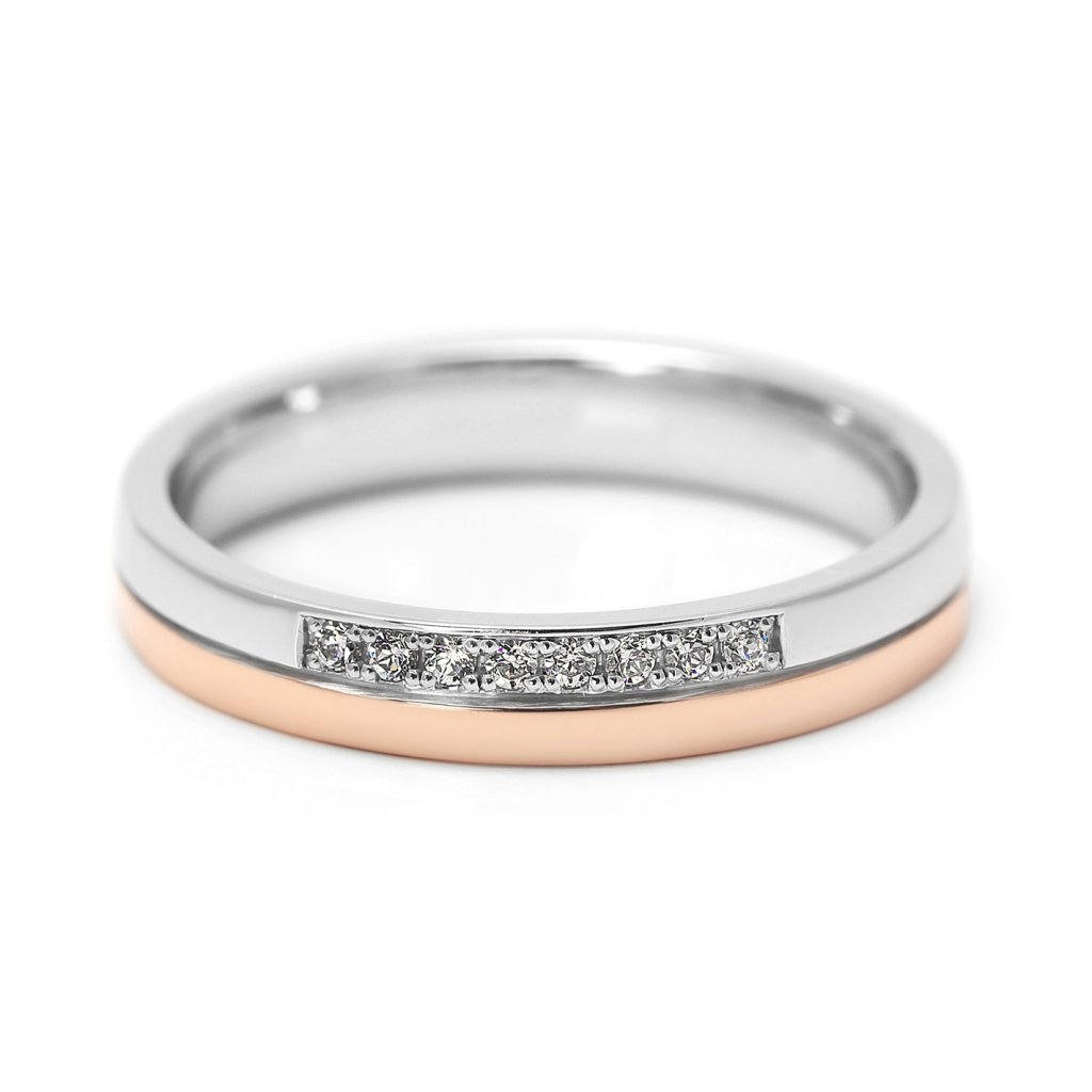 Tento dámský snubní prsten spojuje jemnost růžového zlata s čistotou zlata bílého. Dva kontrastní tóny se prolínají v elegantní kompozici, která působí moderně, ale zároveň velmi romanticky. Osm diamantů o velikosti 1,2 mm je zasazeno do horní části prstenu v pravidelném rytmu, který dodává šperku jiskřivý akcent a vizuální lehkost.