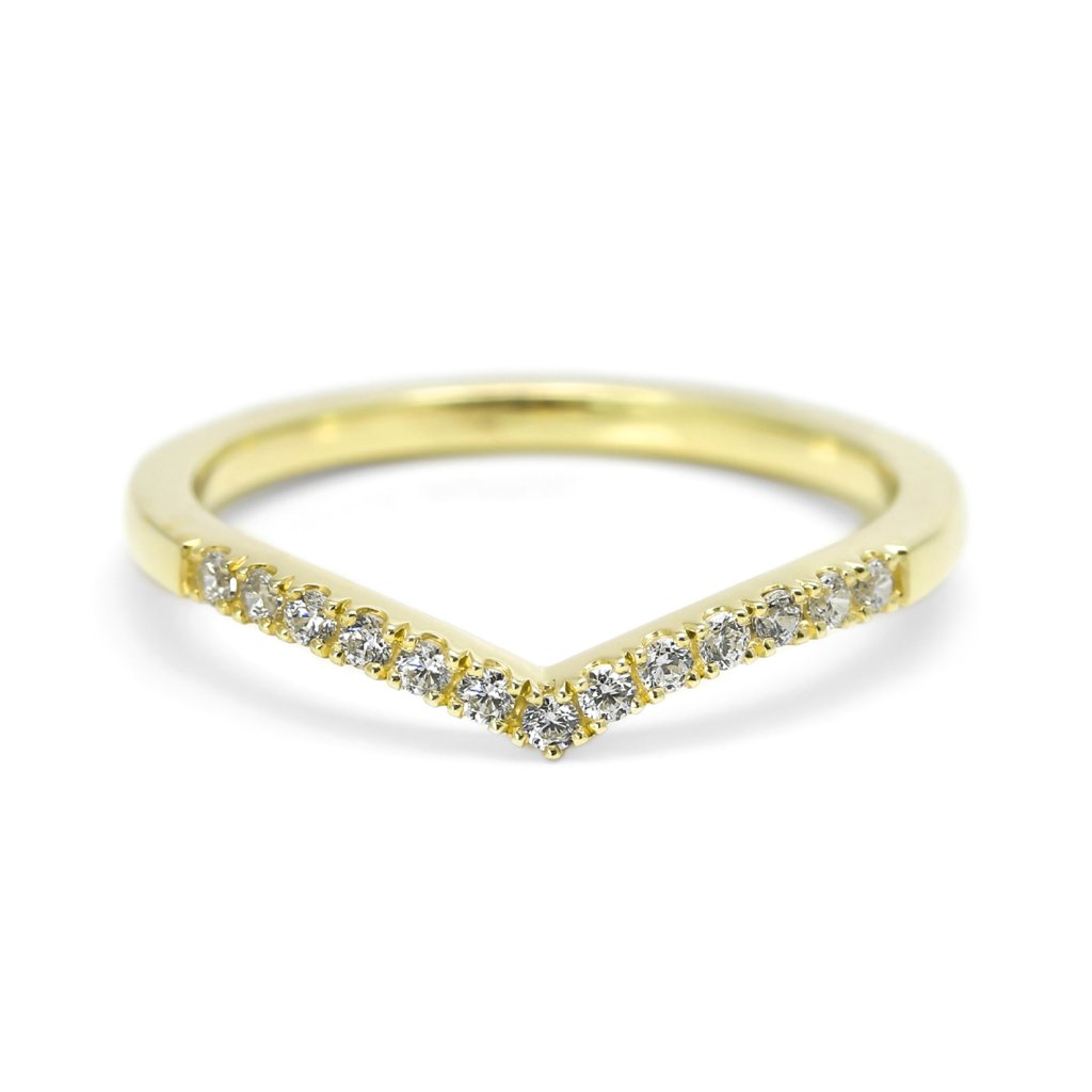 Dámský snubní prsten ze žlutého zlata ve tvaru jemné špičky, zdobený třpytivou linií diamantů. Elegantní, ženský a nadčasový šperk.