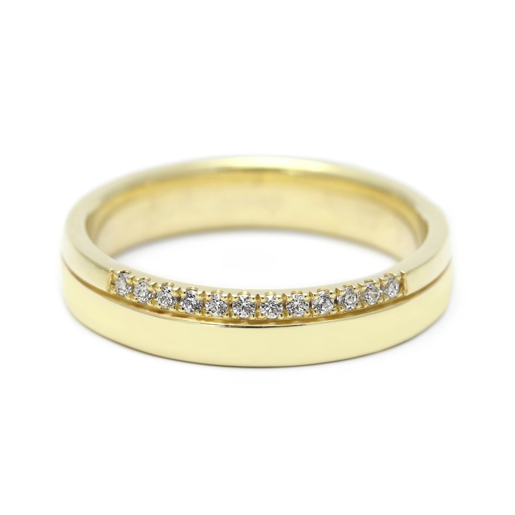 Žluté zlato doplněné dvanácti jemnými diamanty vytváří prsten, který září teplem, elegancí a nadčasovým šarmem.