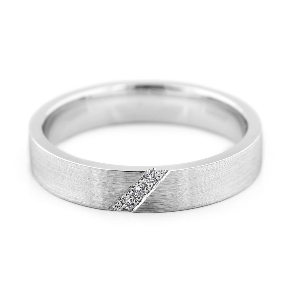 Dámský snubní prsten z bílého zlata s matnou úpravou a třemi diamanty v diagonálním osazení. Moderní, ručně zpracovaný.