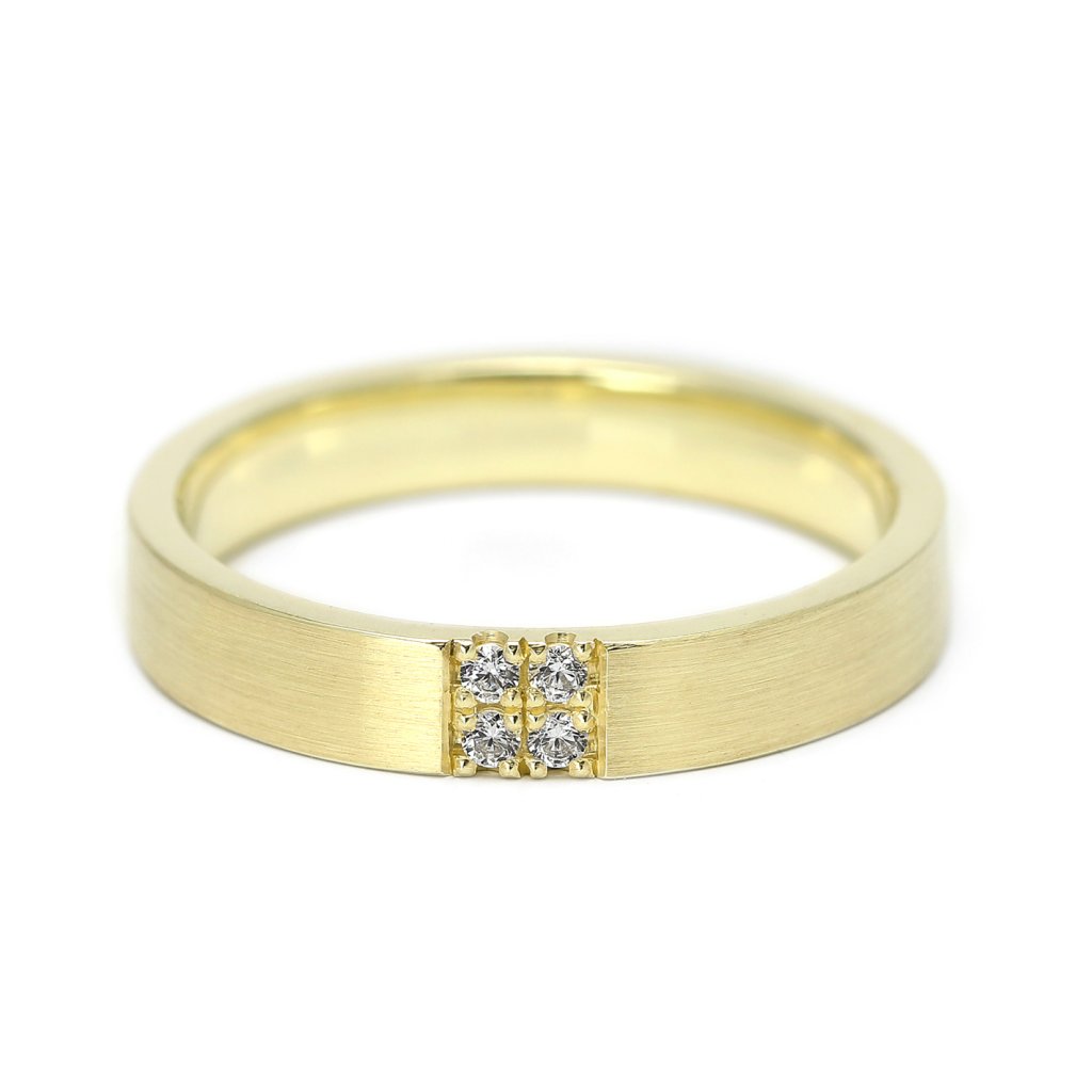 Dámský snubní prsten ze žlutého zlata s matnou úpravou a čtyřmi diamanty. Jemný, originální a ručně zpracovaný.