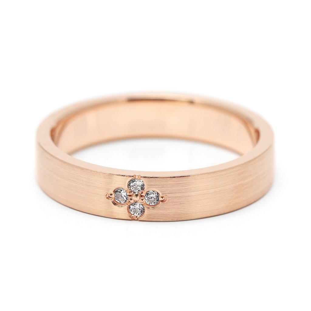 Tento dámský snubní prsten z růžového zlata je ideální volbou pro nevěsty, které hledají romantický, jemný a přitom výrazně zdobený šperk. Po celém obvodu prstenu je vytvořen dekorativní diamantový motiv připomínající drobné čtyřlístky či květinové ornamenty. Tento detailní vzor dodává prstenu něžný, ženský a luxusní vzhled. Růžové zlato podtrhuje moderní, hřejivý charakter šperku a krásně zvýrazňuje třpyt diamantů.