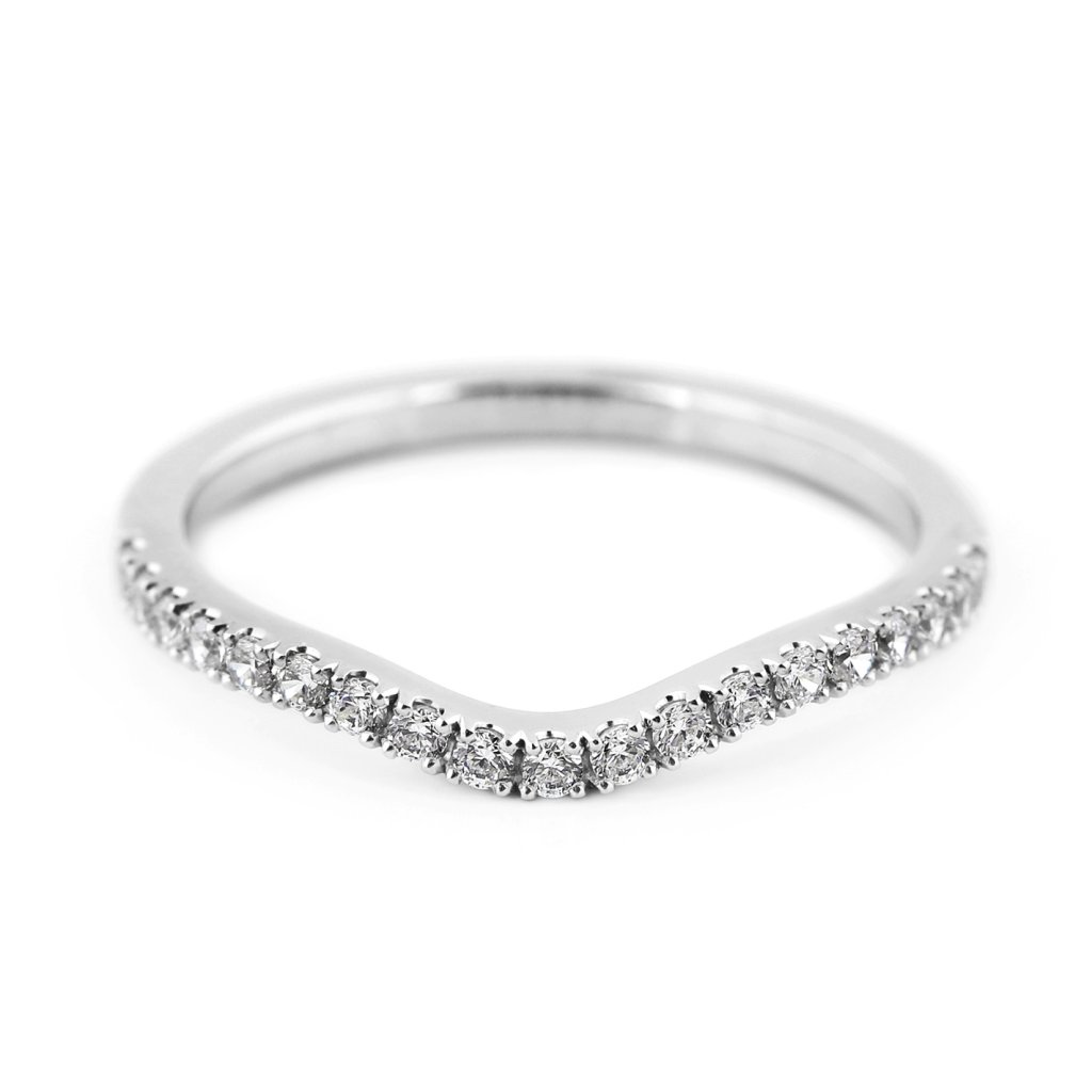 Jemný dámský snubní prsten z bílého zlata s elegantně prohnutou diamantovou linií v horní části. Moderní, ženský a dokonale třpytivý šperk.