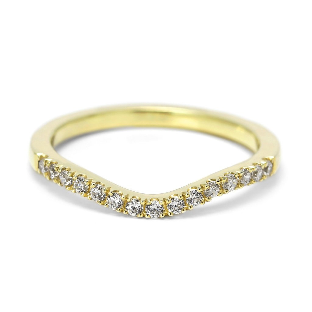 Elegantní dámský snubní prsten ze žlutého zlata s jemně prohnutou diamantovou linií v horní části. Něžný, moderní a krásně třpytivý šperk.