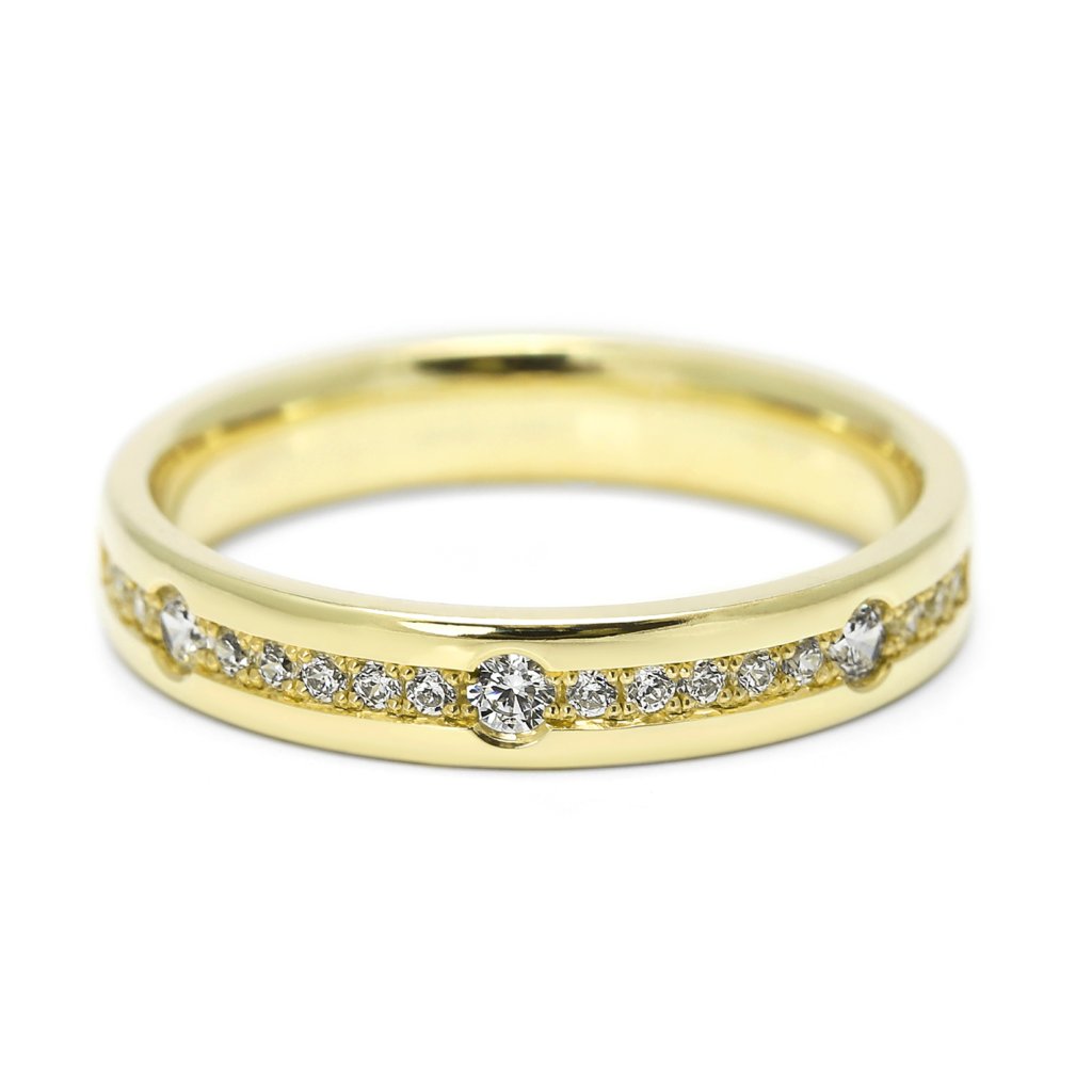 Snubní prsten ze žlutého zlata osazený diamanty v elegantní rytmické kompozici. Luxusní šperk s precizním zpracováním, navržený pro ženy, které chtějí spojit třpyt s nadčasovým stylem.