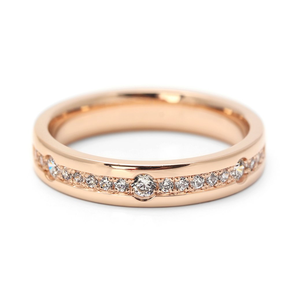 Snubní prsten z růžového zlata osazený diamanty ve výrazné rytmické kompozici. Elegantní šperk, který spojuje jemnost růžového zlata s brilantním třpytem a působí skutečně výjimečně.