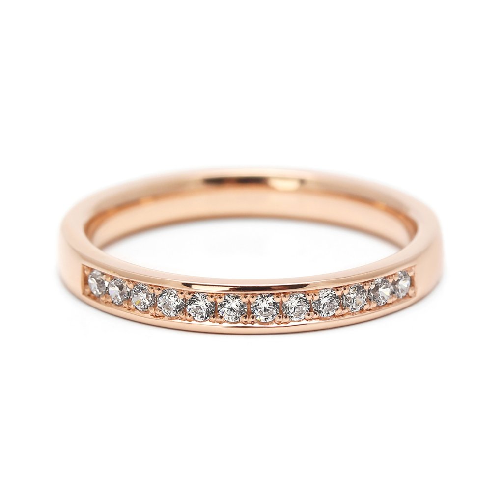 Tento dámský snubní prsten z růžového zlata je ztělesněním jemné elegance. Do tenkého pásku je zasazeno 12 diamantů o velikosti 1,4 mm, které vytvářejí decentní linii třpytu. Růžové zlato dodává šperku měkký, ženský tón, zatímco diamanty září čistotou a precizností.
