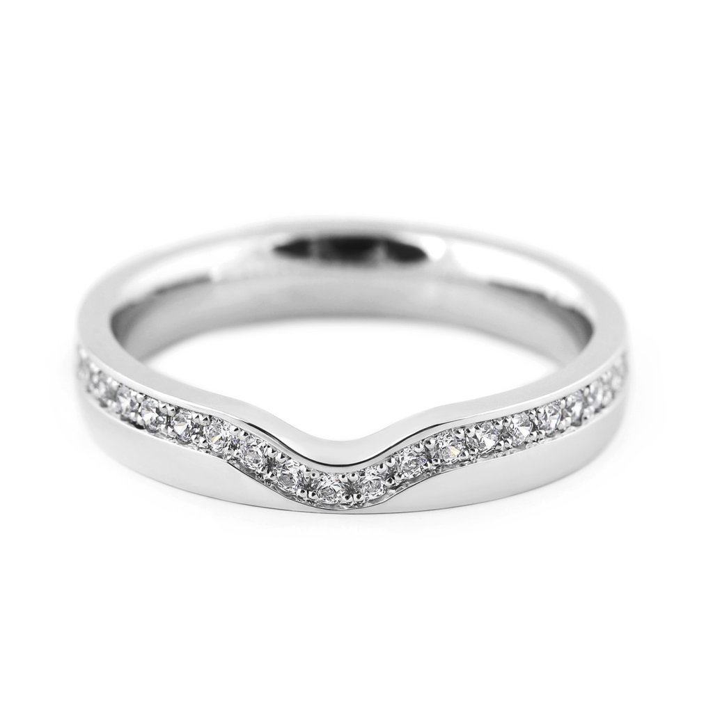 Zakřivený snubní prsten z bílého zlata osazený diamanty v souvislé linii. Elegantní šperk, který ladí s jinými prsteny a září samostatně.