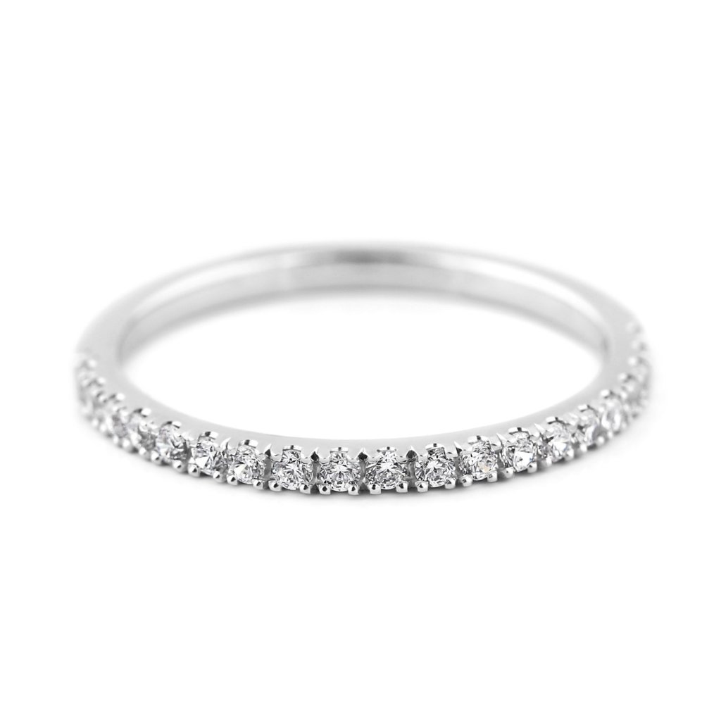 Tento dámský snubní prsten z bílého zlata je definicí jemného luxusu. Do tenkého pásku je precizně zasazeno 20 diamantů o velikosti 1,4 mm, které vytvářejí souvislou linii třpytu. Díky minimalistickému provedení působí prsten subtilně, ale zároveň elegantně — ideální volba pro ženy, které preferují decentní šperky s výrazem.
