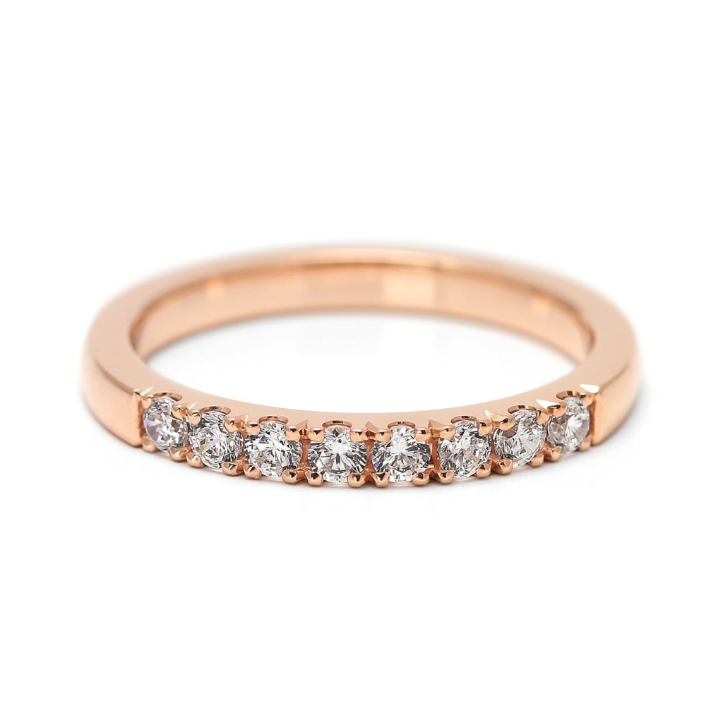 Dámský snubní prsten z růžového zlata s osmi diamanty. Jemný, jiskřivý a ručně zhotovený šperk s romantickým tónem.