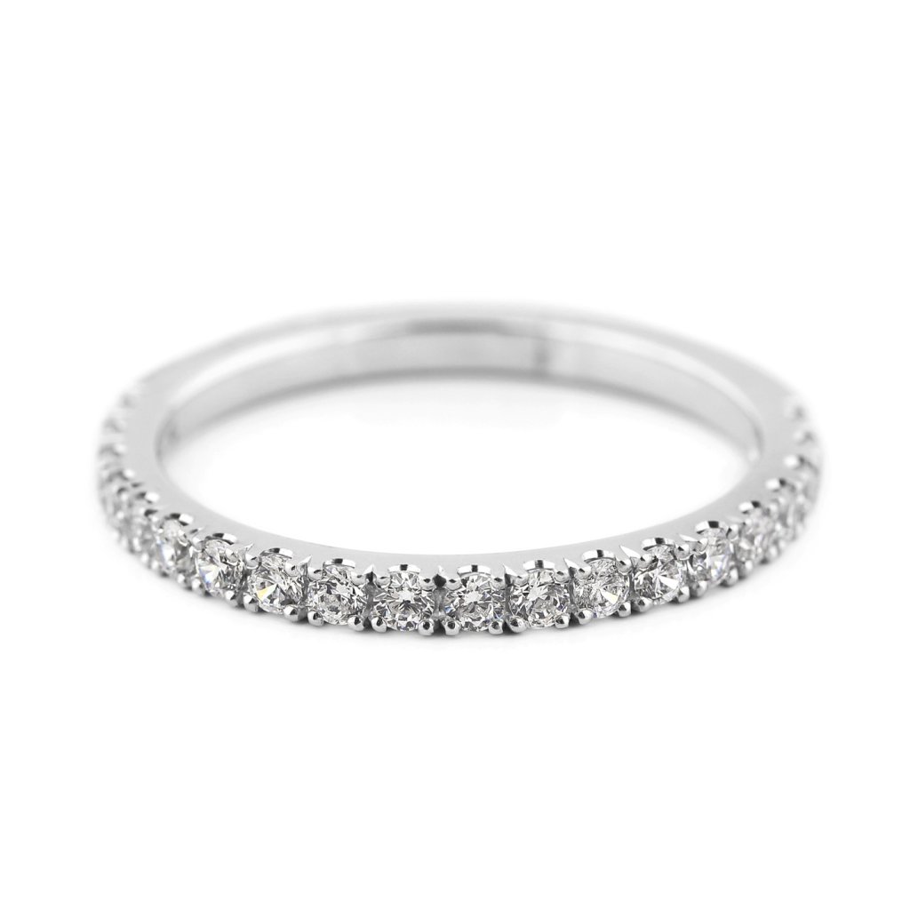 Tento dámský snubní prsten z bílého zlata je ztělesněním věčné elegance. Dvacet diamantů o velikosti 1,7 mm je zasazeno po celém obvodu prstenu v jemném rytmu, který vytváří souvislou jiskřivou linii. Prsten působí jako nekonečný kruh světla — bez začátku a konce, stejně jako láska, kterou symbolizuje.