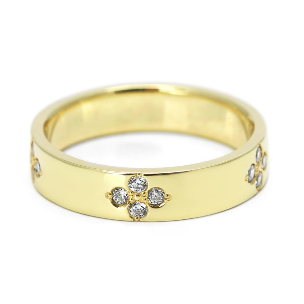 Tento dámský snubní prsten ze žlutého zlata je určen pro nevěsty, které hledají elegantní, romantický a výrazně zdobený šperk. Po celém obvodu prstenu je vytvořen jemný diamantový motiv připomínající drobné čtyřlístky či květinové ornamenty. Tento detailní vzor dodává prstenu ženský, něžný a luxusní vzhled. Žluté zlato podtrhuje teplý, klasický charakter šperku a krásně zvýrazňuje třpyt diamantů.