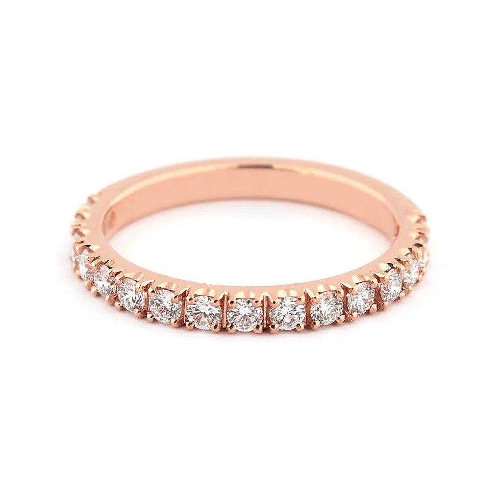 Tento prsten z červeného zlata je ukázkou jemné elegance a mistrovského šperkařského umění. Ručně vyrobený šperk zdobí 16 vzácně bílých přírodních diamantů (ø 2,05 mm, celkem 0,534 ct), zasazených do šíny tak, aby vytvořily nepřehlédnutelnou jiskřivou linii.