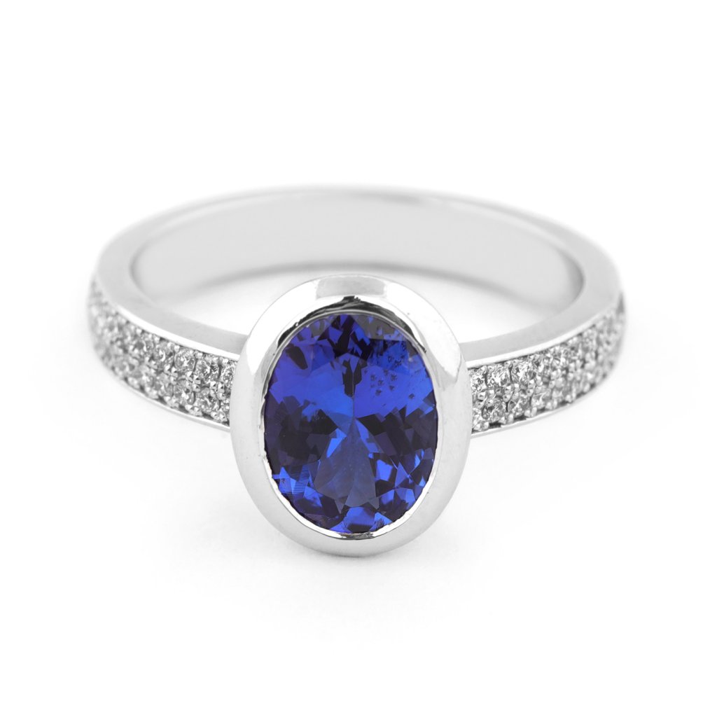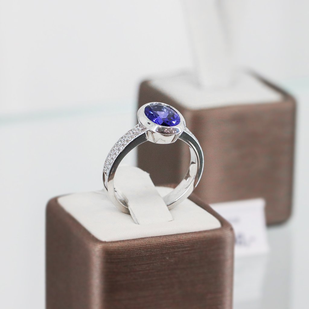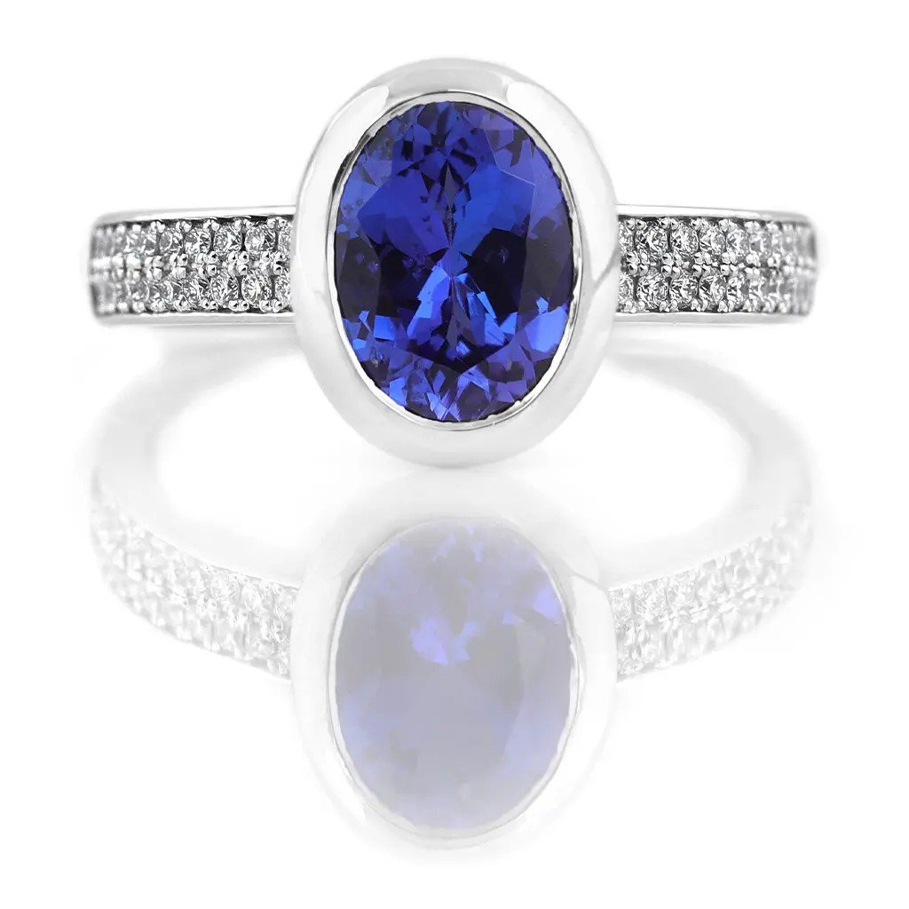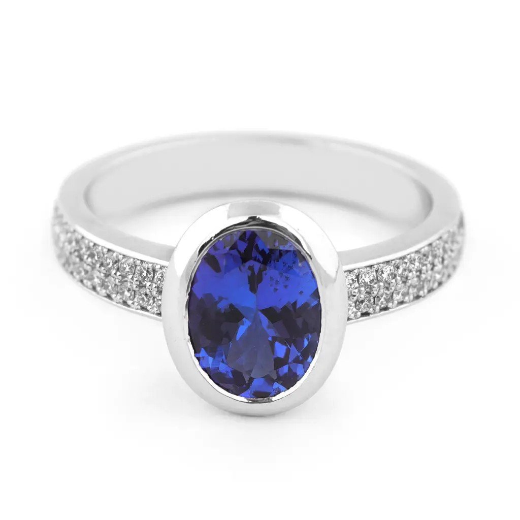 Jedinečný prsten z bílého zlata s oválným tanzanitem 1,873 ct a 40 diamanty 0,220 ct. Komfortní, elegantní a perfektní pro zásnuby nebo speciální příležitosti.