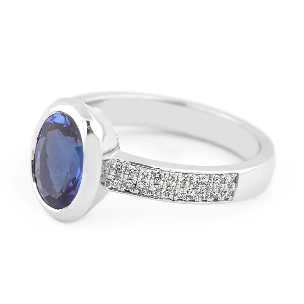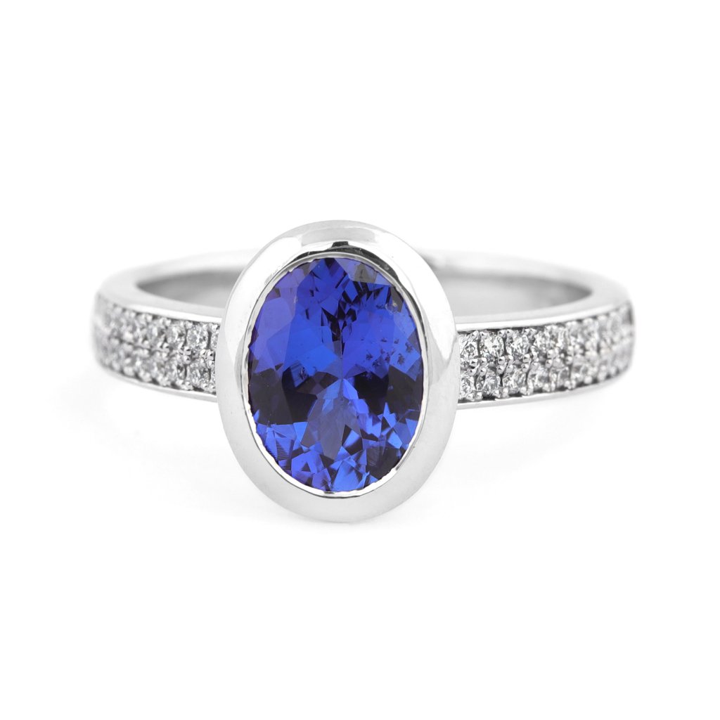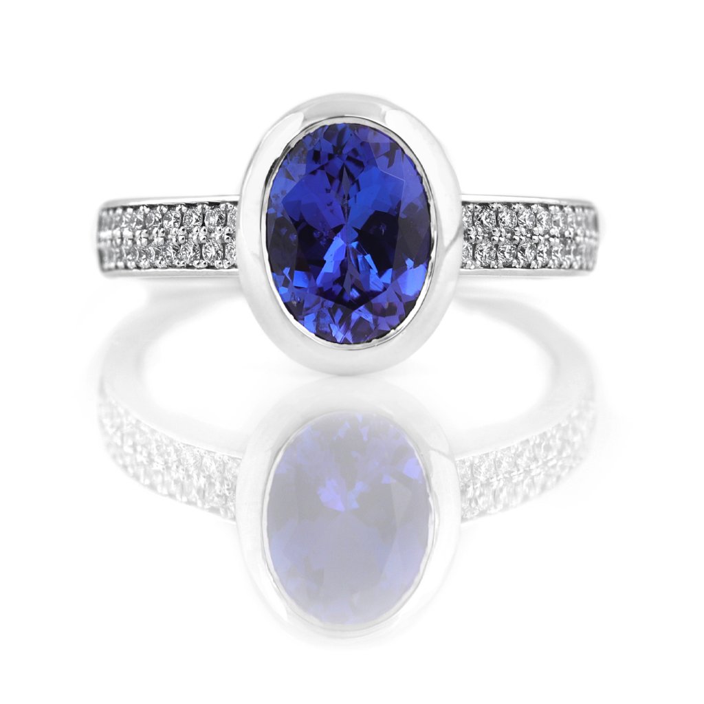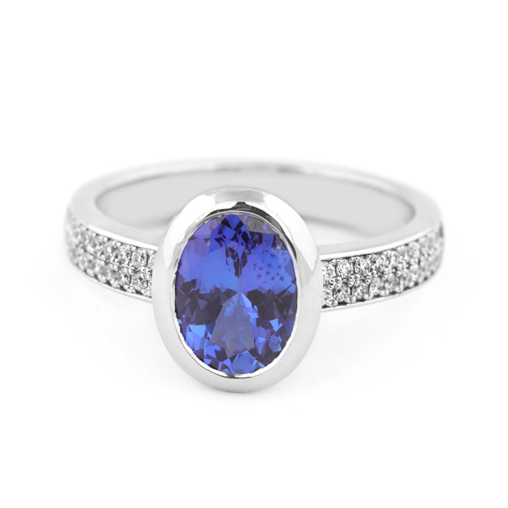 Jedinečný prsten z bílého zlata s oválným tanzanitem 1,873 ct a 40 diamanty 0,220 ct. Komfortní, elegantní a perfektní pro zásnuby nebo speciální příležitosti.