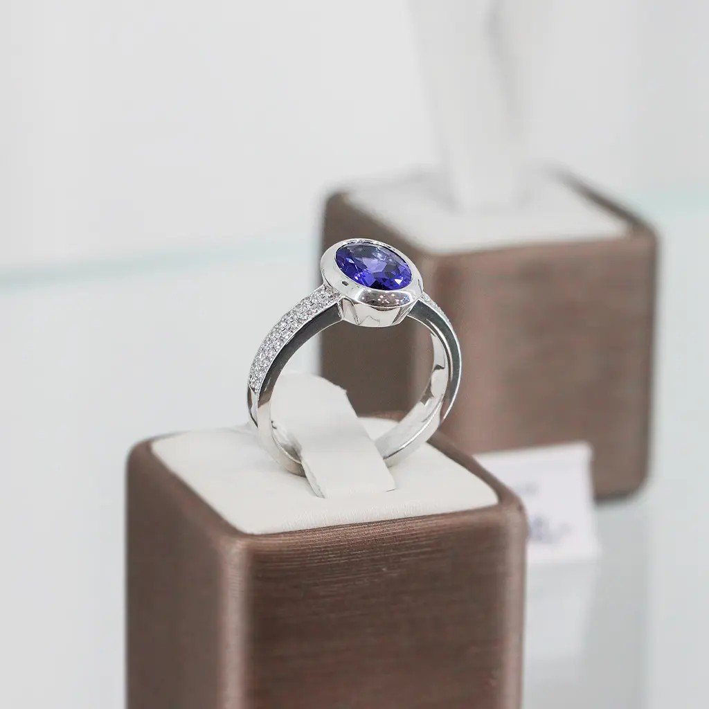 Ručně vyrobený prsten z bílého zlata Au 585/1000 o hmotnosti 5,15 g je šperkem, který v sobě spojuje eleganci a vzácnost. Dominantou je přírodní tanzanit v oválném fasetovaném brusu o rozměrech 9,14 × 6,96 × 4,33 mm a hmotnosti 1,873 ct. Jeho nádherná nafialověle modrá, transparentní barva působí kouzelně a jedinečně.
