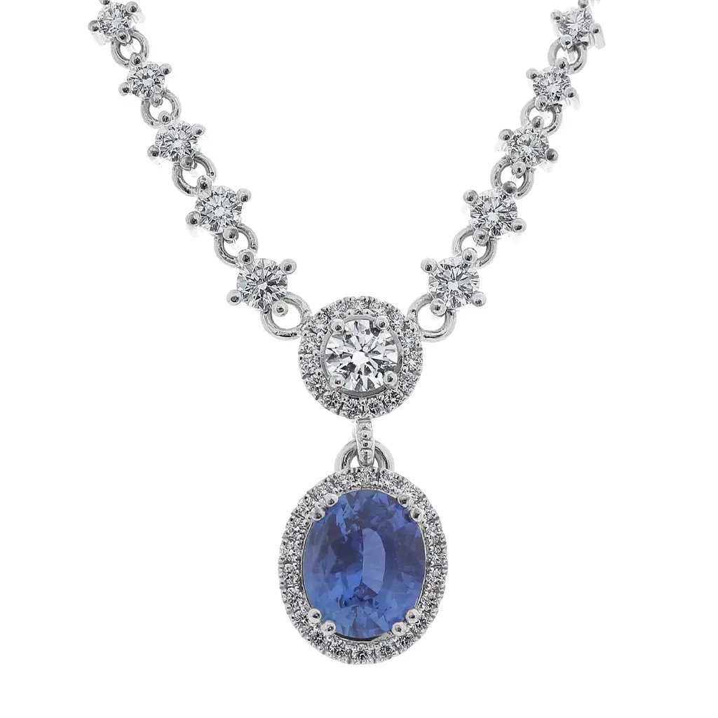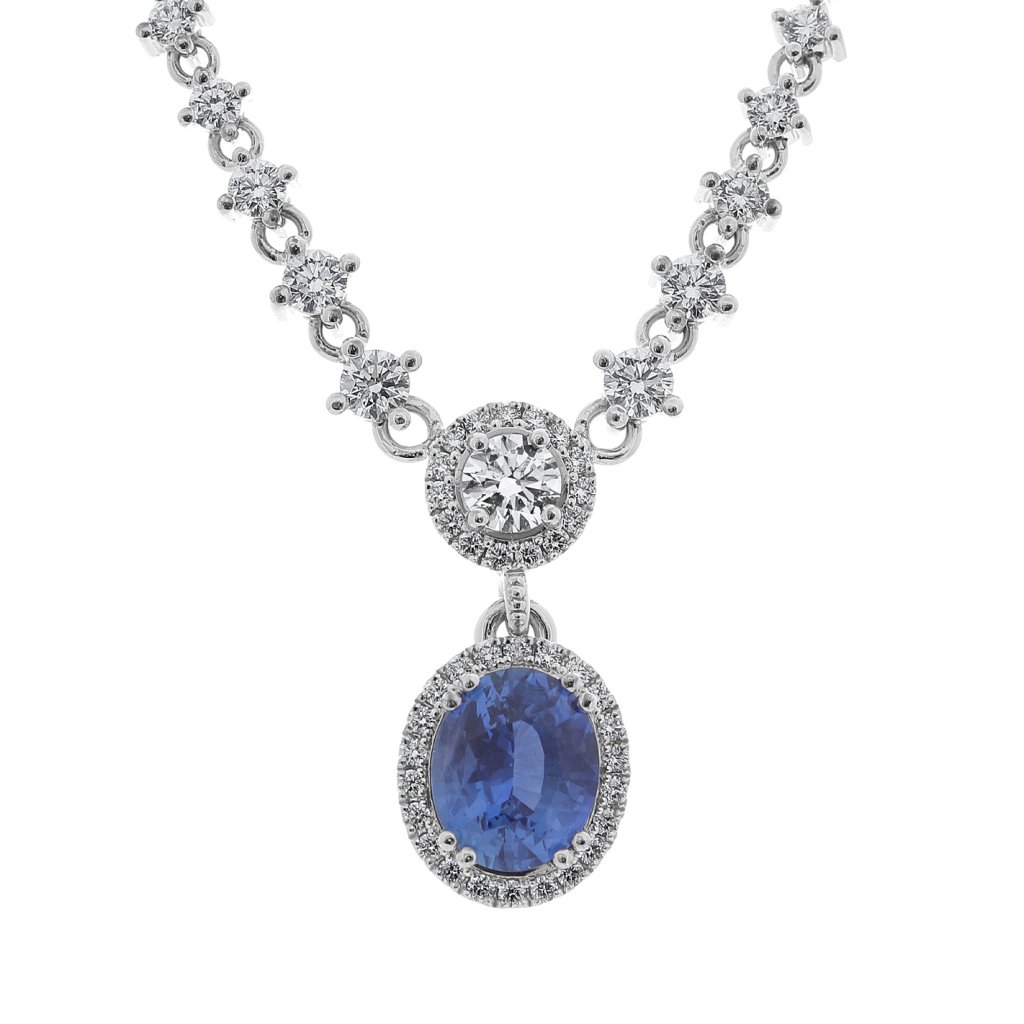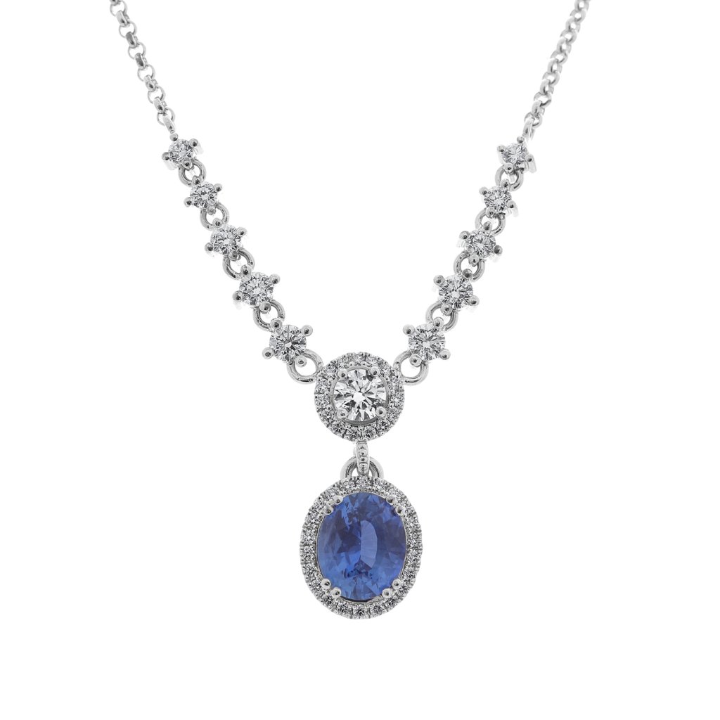 Nezapomenutelný safírový náhrdelník z bílého zlata, který osloví i ty nejnáročnější milovníky šperků. Dominantou je přírodní modrý korund – safír v kombinovaném oválném brusu bez známek tepelné úpravy, o rozměrech 8,34×6,87×4,48 mm a hmotnosti 2,037 ct. Sytě modrý safír krásně kontrastuje s diamanty nejvyšší kvality. Náhrdelník zdobí výjimečně bílý diamant (E, čistota VS) v kulatém briliantovém brusu o průměru 4,1 mm a hmotnosti 0,250 ct. Dále je doplněn deseti vzácně bílými diamanty (F–G, čistota VS) o celkové hmotnosti 0,596 ct a průměru 2,05–2,9 mm. Nechybí ani 72 drobných diamantů (F–G–H, čistota VS) o celkové hmotnosti 0,329 ct a průměru 0,95–1,15 mm, které dodávají šperku jemný třpyt a luxusní charakter. Celková hmotnost zlata ryzosti 585/1000 činí 6,55 g.