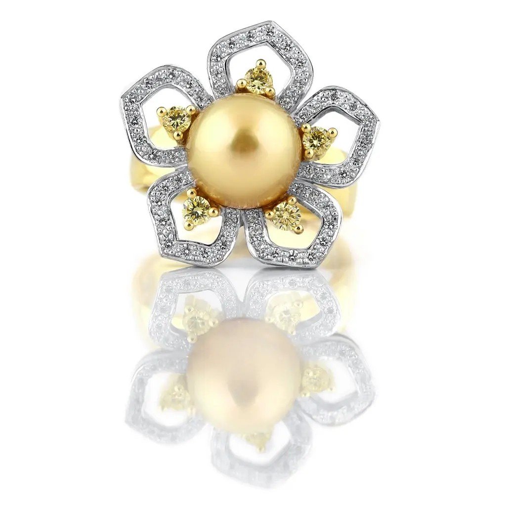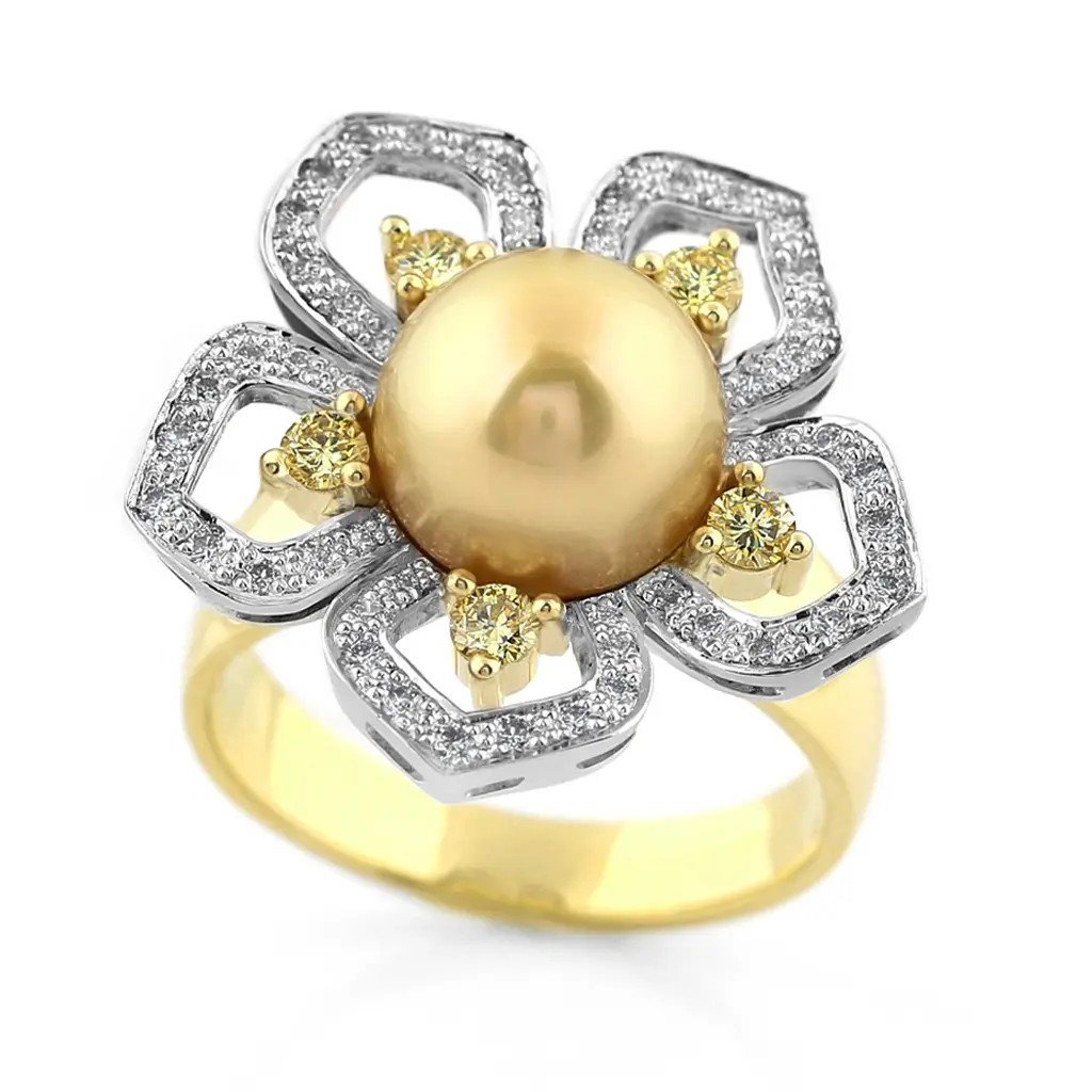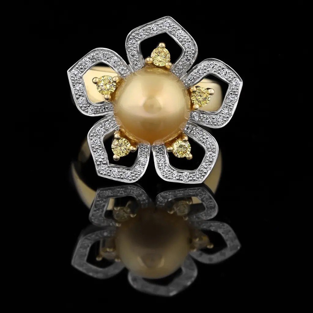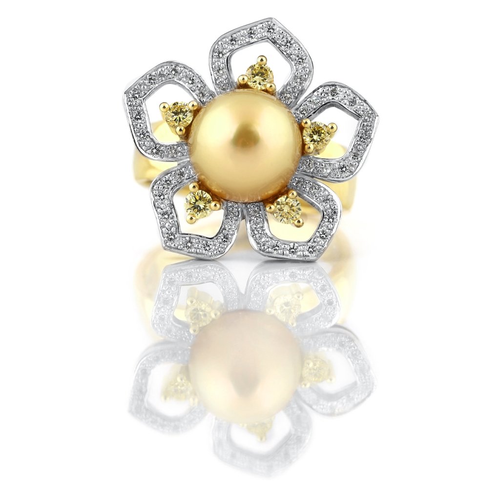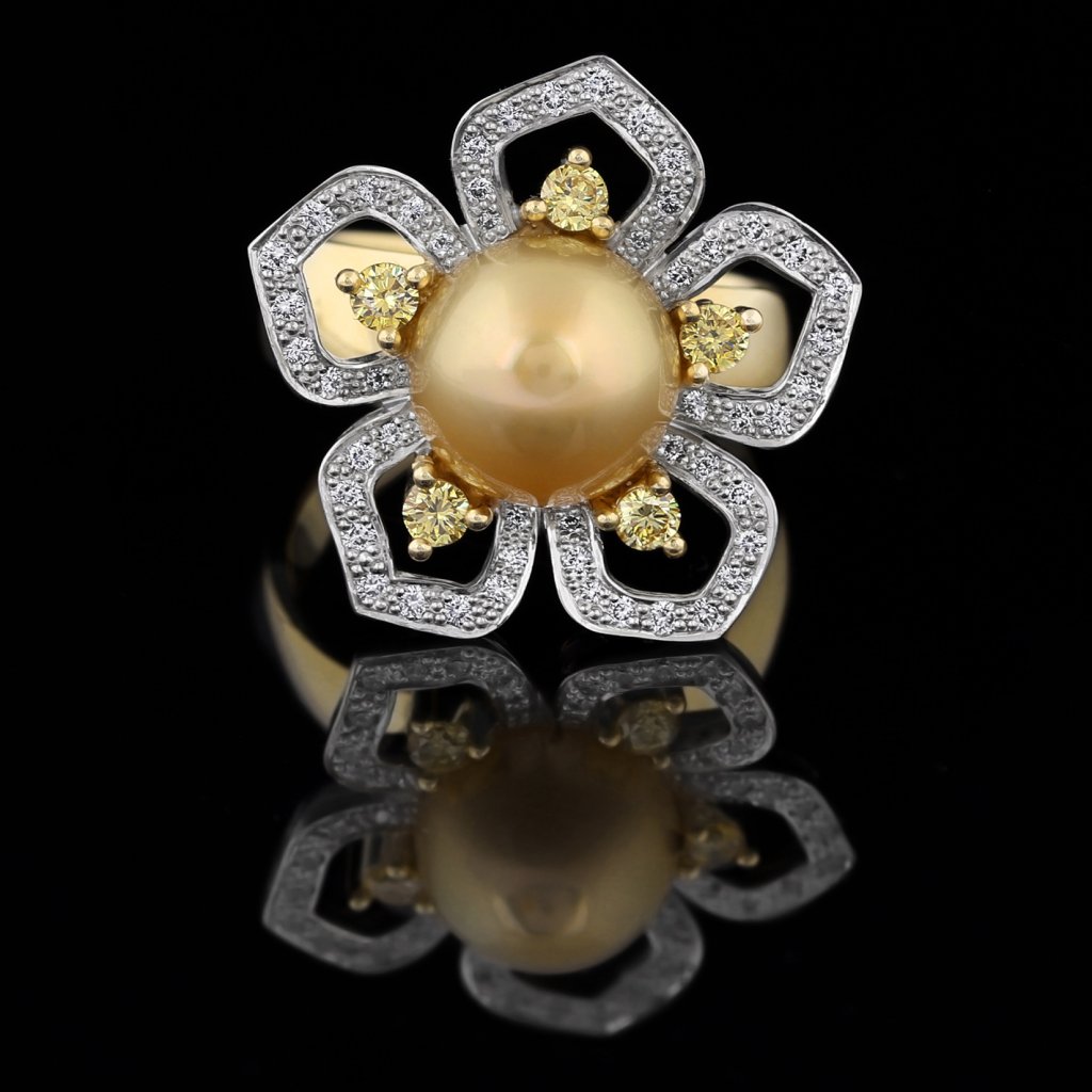 Exkluzivní prsten ve tvaru květu s diamanty a mořskou perlou Tahiti v kombinaci žlutého a bílého zlata, vel. 55