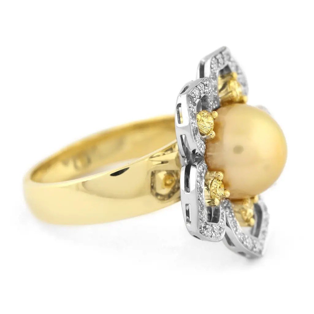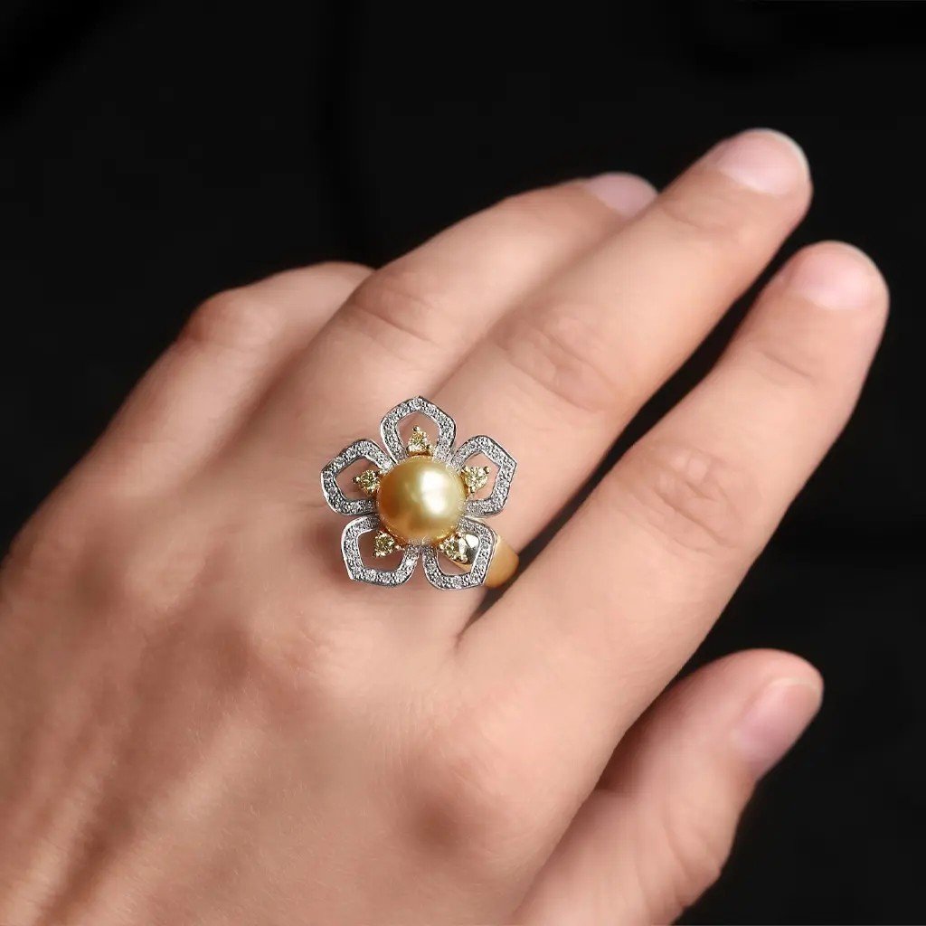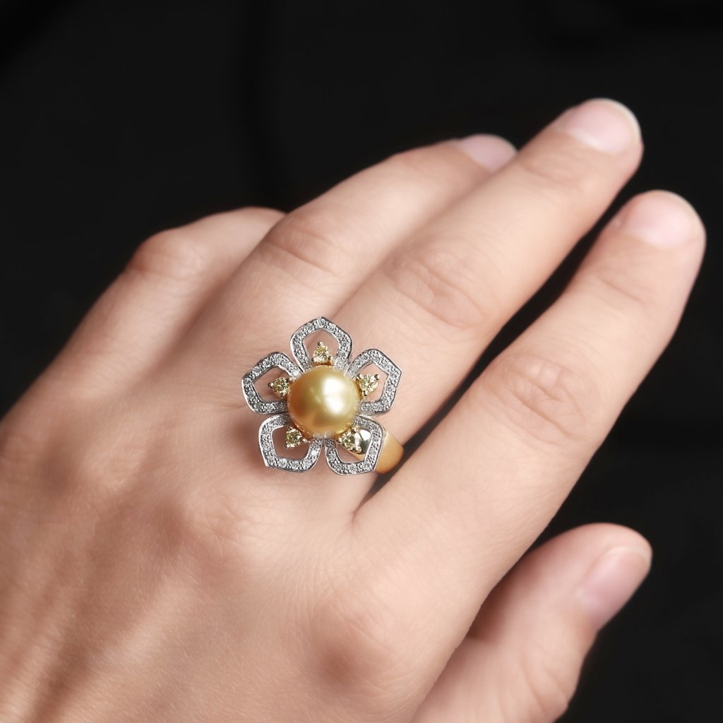 Nadčasová elegance, jedinečná vzácnost – to je prsten ve tvaru rozkvetlého květu, vytvořený v naší zlatnické dílně. Tento originál z bílého a žlutého zlata (Au 585/1000, 8,12 g) nese v srdci kultivovanou mořskou perlu Tahiti ve zlatě žluté barvě. Perla o průměru 9,7–9,8 × 9,5 mm (6,354 ct) je symbolem čistoty a noblesy, která přitahuje obdivné pohledy.