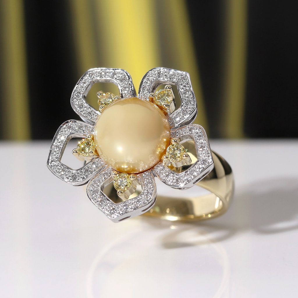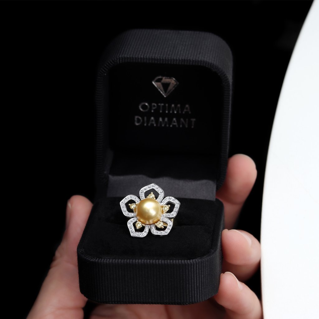 Krásu perly zvýrazňuje pět žlutých diamantů (0,275 ct) a padesát vzácně bílých diamantů (0,312 ct, VS, F–G–H), které vytvářejí dokonalou hru světla a luxusu. Celek působí jako rozkvetlý šperk přírody, přetavený do podoby rodinného klenotu.