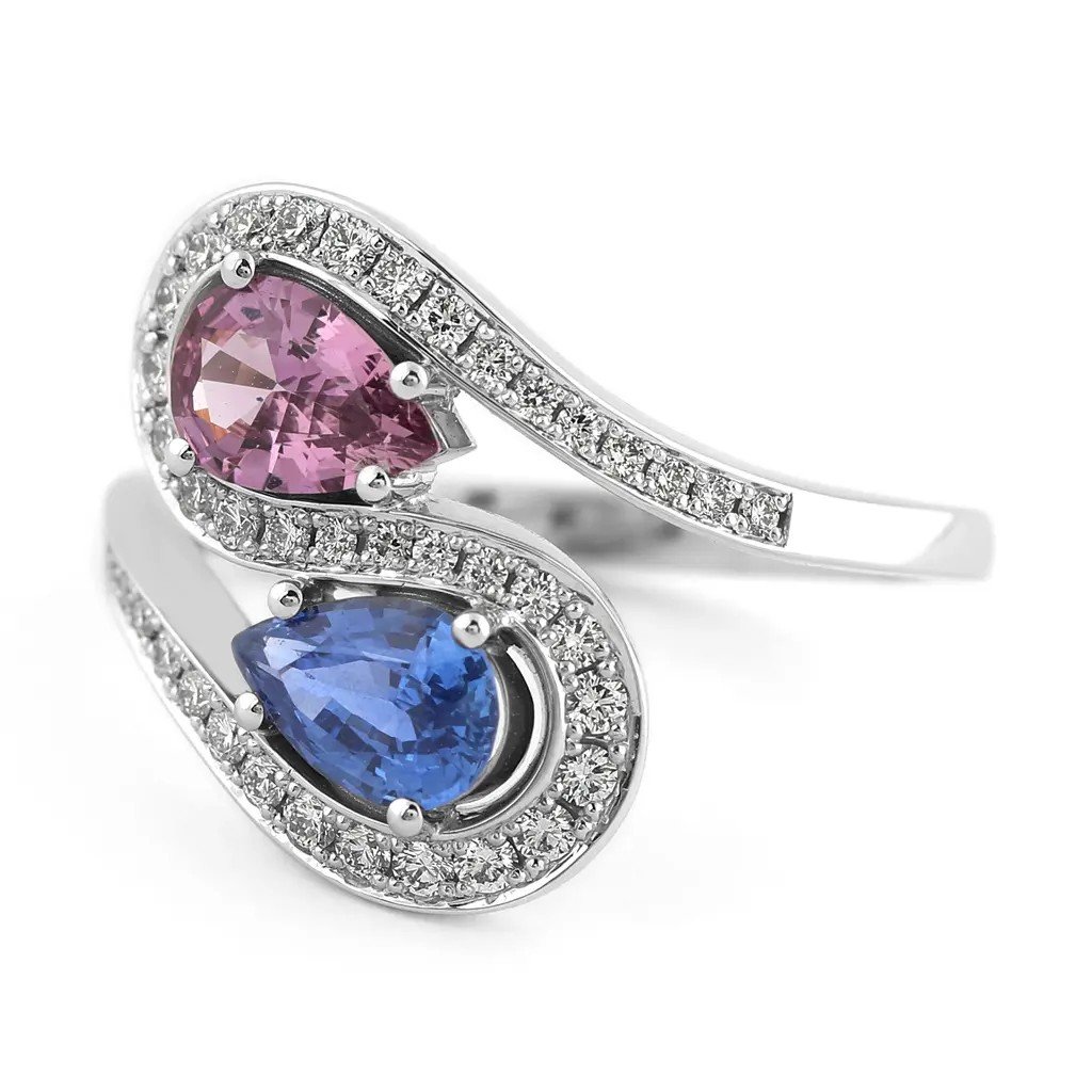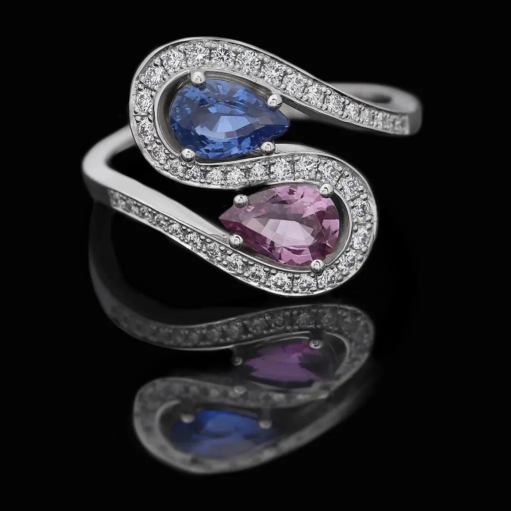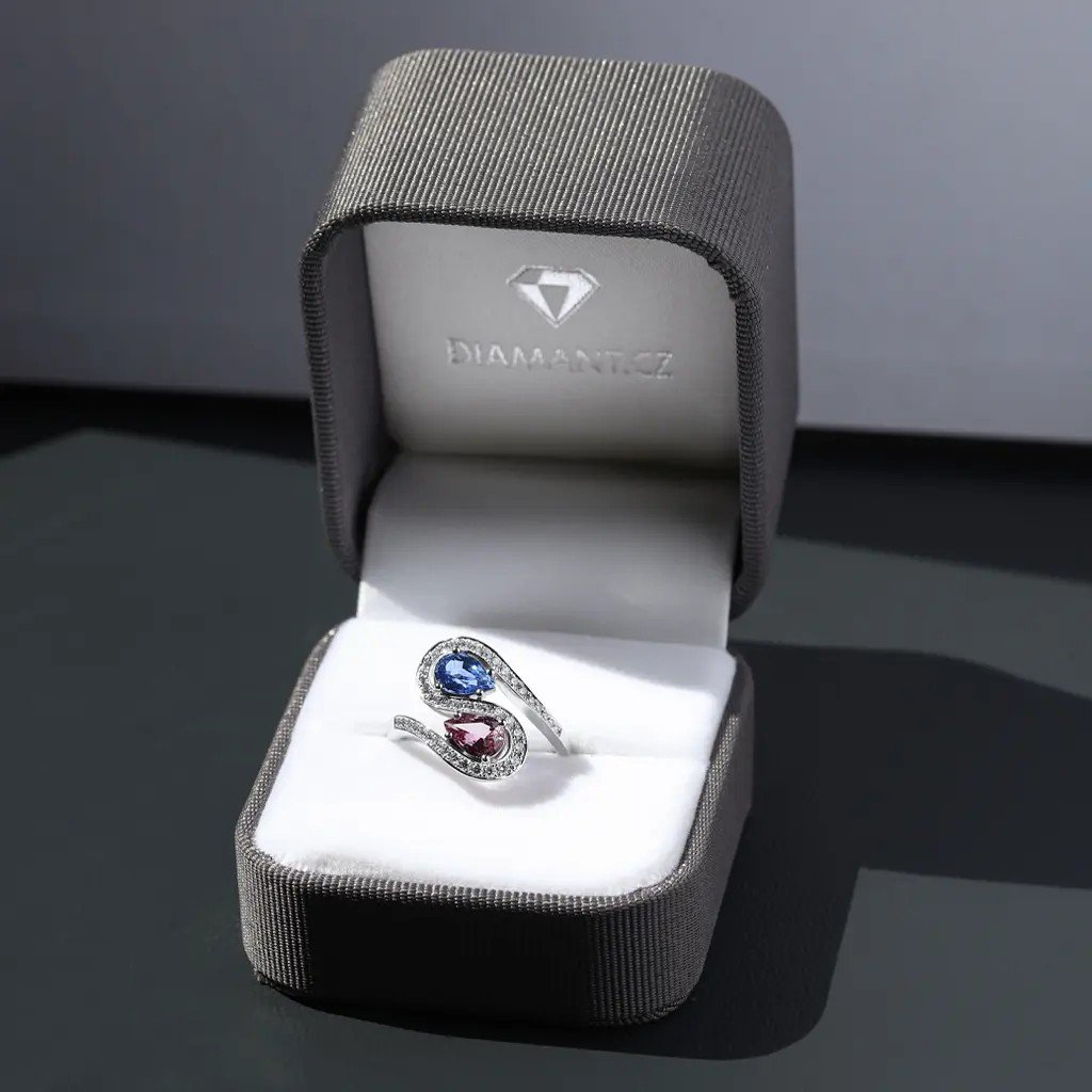 Moderní prsten z bílého zlata osazený modrým a purpurovým safírem a zářivými diamanty. Jedinečná kombinace barev a nadčasový design, který podtrhne Vaši osobnost.
