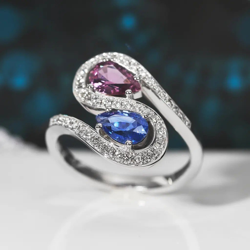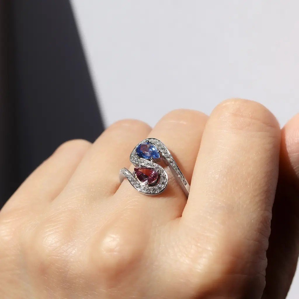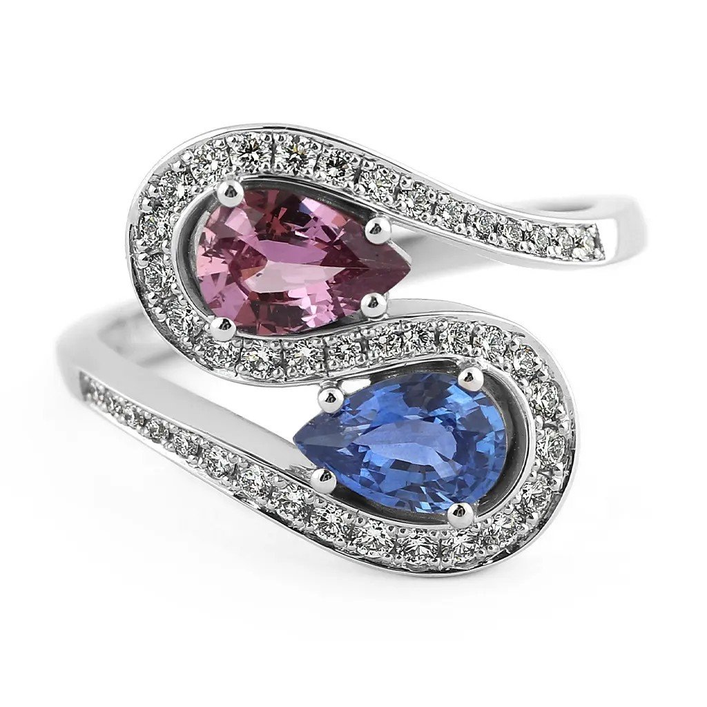 Moderní prsten z bílého zlata osazený modrým a purpurovým safírem a zářivými diamanty. Jedinečná kombinace barev a nadčasový design, který podtrhne Vaši osobnost.