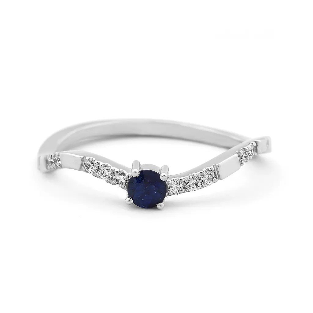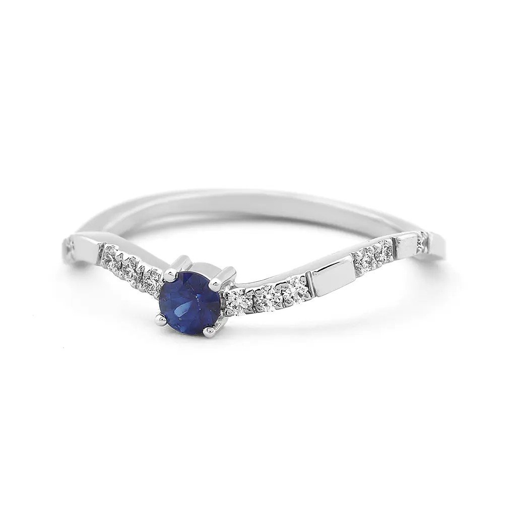 Dominantou prstenu je přírodní safír – modrý, transparentní korund o hmotnosti 0,199 ct a průměru 3,45 mm, jehož hloubka barvy je podtržena jemným briliantovým brusem. Kámen byl odborně tepelně upraven (TE), aby vynikl jeho přirozený lesk a sytost odstínu.