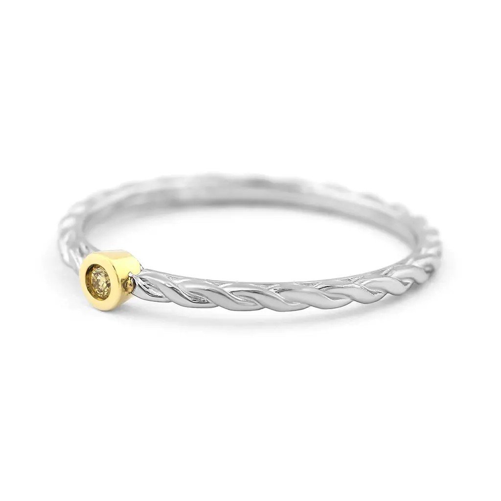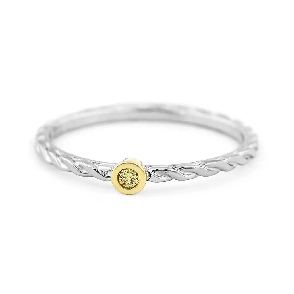 Nadčasový prsten z bílého a žlutého zlata je dokonalou ukázkou jemné elegance a čistého designu. Do šperku je vsazen přírodní diamant kulatého briliantového brusu o průměru 1,65 mm a hmotnosti 0,019 ct. Kámen v žlutém odstínu, s čistotou SI1 a přirozeným půvabem, dodává prstenu jedinečný charakter a lehký nádech originality.