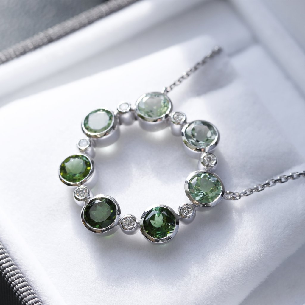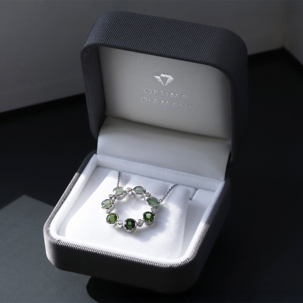 Hlavním prvkem šperku je sedm přírodních zelených turmalínů kulatého fasetového brusu o celkové hmotnosti 4,328 ct. Různé odstíny zelené barvy dodávají náhrdelníku unikátní hloubku a dynamiku. Barevnou kompozici rozzařuje sedm přírodních diamantů v briliantovém brusu o hmotnosti 0,174 ct (barva F–G, čistota VS–SI1), které jsou citlivě vloženy mezi drahokamy.