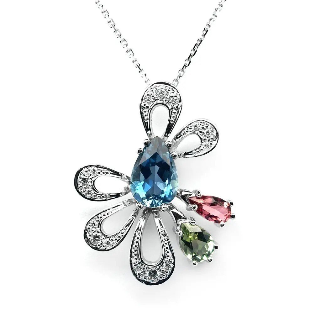 Ručně vyrobený náhrdelník z bílého zlata s akvamarínem, přírodními turmalíny a diamanty. Elegantní a nadčasový šperk, který zaujme svými barvami a precizním zpracováním, ideální jako luxusní dárek.