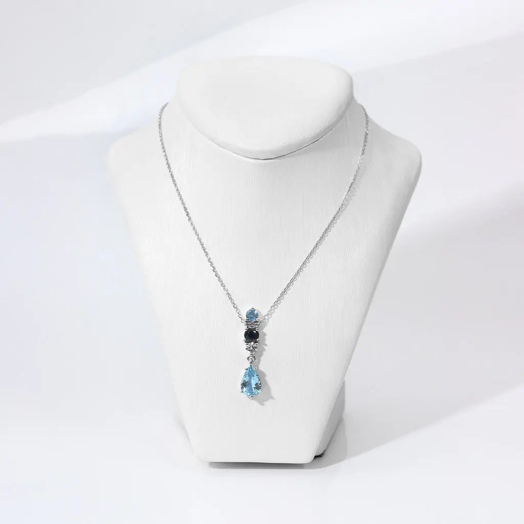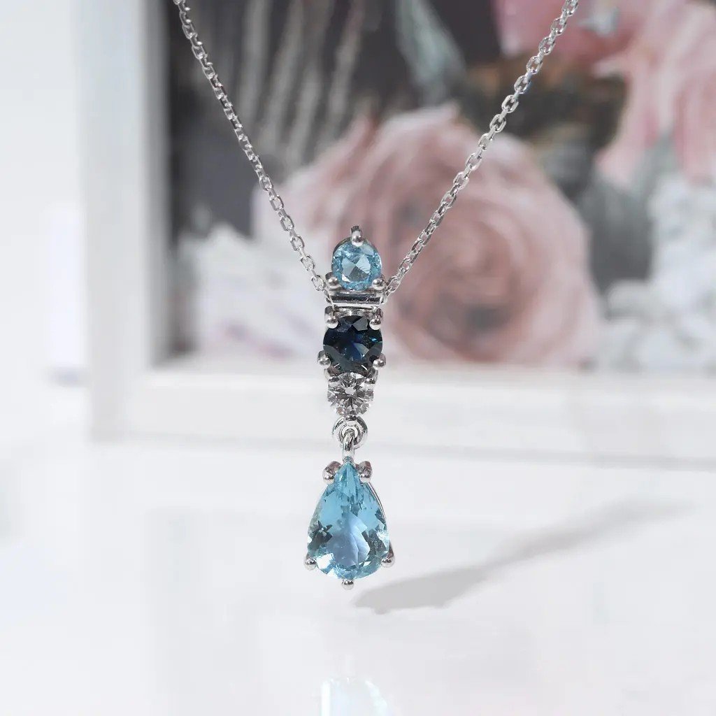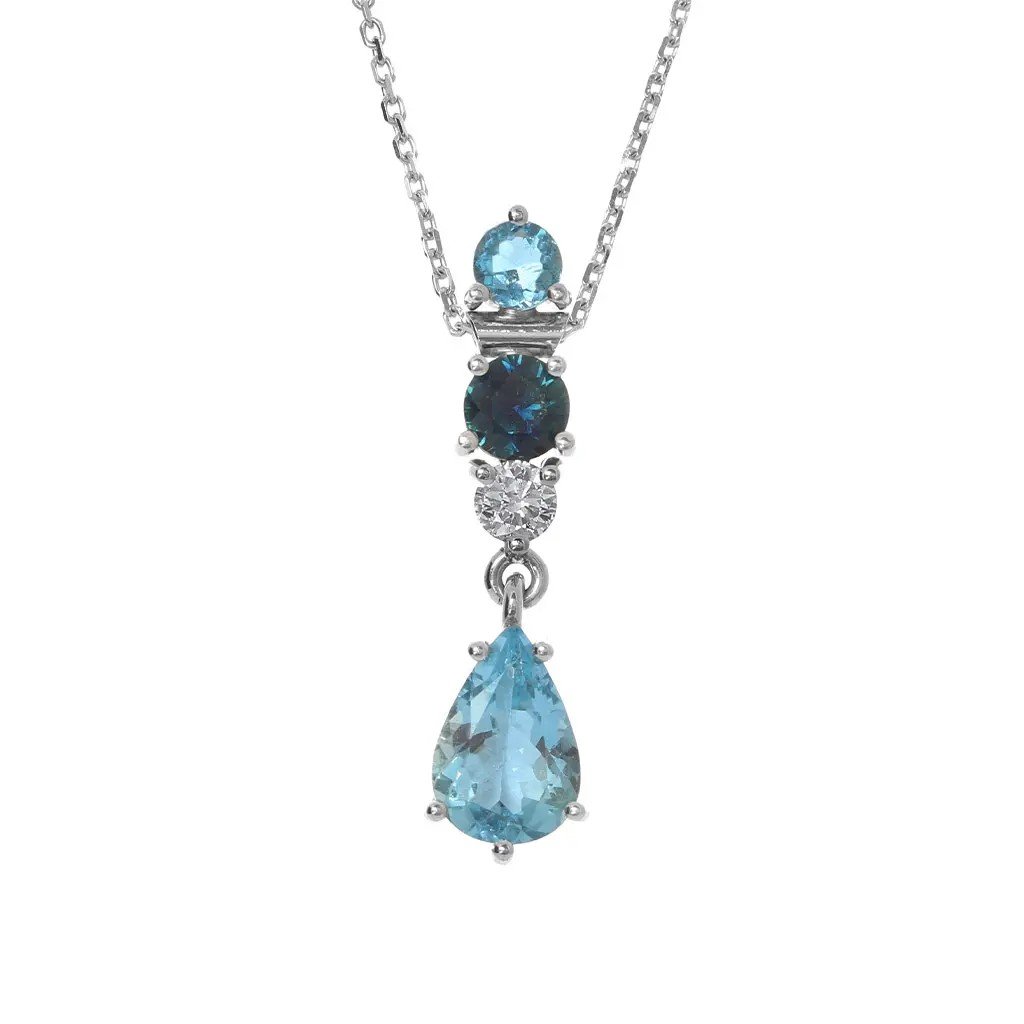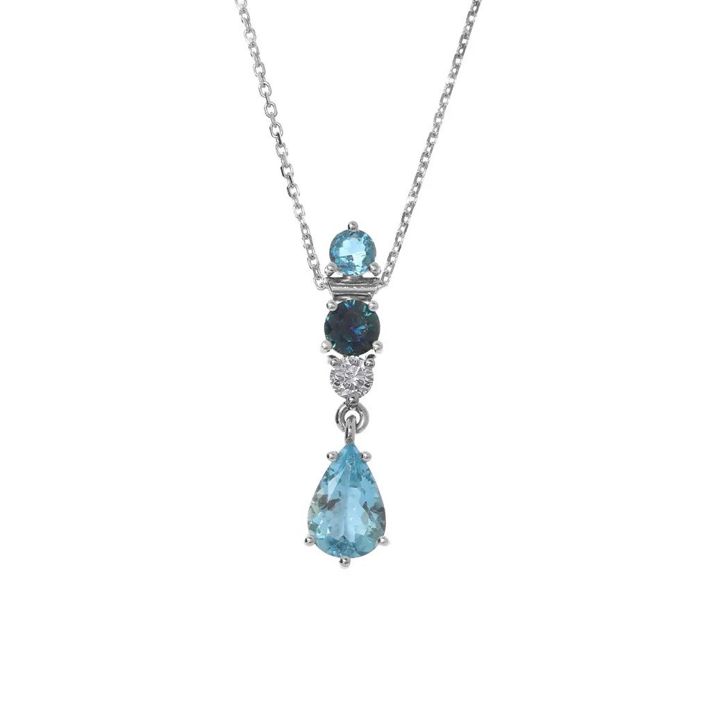 Ručně vyrobený náhrdelník z bílého zlata s akvamarínem, safírem a diamantem. Elegantní šperk s jedinečnou kombinací drahokamů.