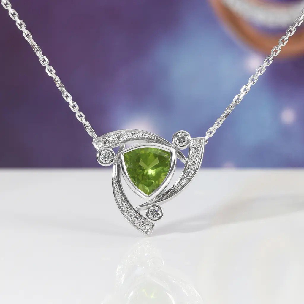 Poznejte kouzlo výjimečnosti s tímto luxusním náhrdelníkem z bílého zlata, který kombinuje svěžest přírodního peridotu a oslnivou jiskru diamantů. Nažloutle zelený triliant fasetovaný peridot, precizně opracovaný do rozměru 8,0–8,05 mm a vážící 1,638 ct, přináší do vašeho šperkového arzenálu neobyčejnou eleganci a živost. Jemné diamanty vzácně bílé barvy (F–G) a čistoty SI1 dokonale podtrhují krásu peridotu, vytvářejí sofistikovanou hru světla a lesku a zajišťují, že náhrdelník bude přitahovat pohledy všude, kam se vydáte. Vyroben z kvalitního bílého zlata 585/1000 s čistou hmotností 4,95 g, tento šperk nabízí nejen luxusní vzhled, ale i nadčasovou hodnotu a odolnost, která vydrží generace.