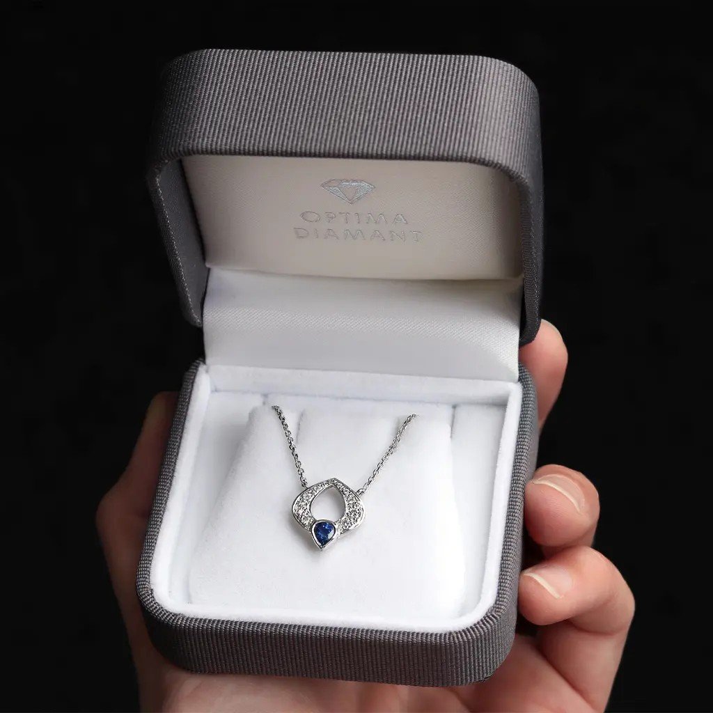 Elegantní náhrdelník z bílého zlata s hluboce modrým safírem a jiskrnými diamanty. Luxusní šperk, který přitahuje pohledy a stane se vaším výjimečným rodinným klenotem.