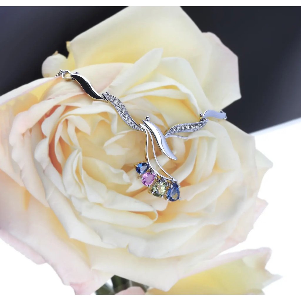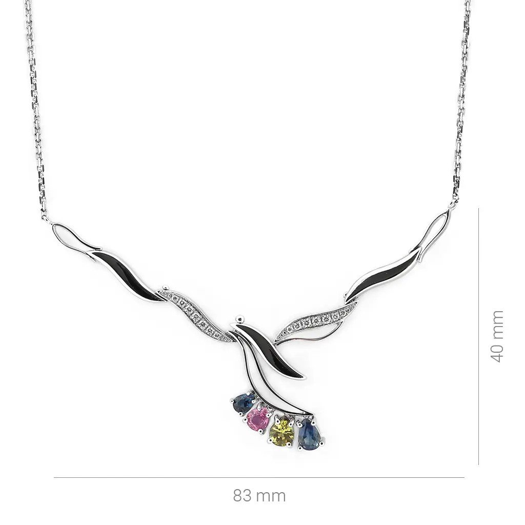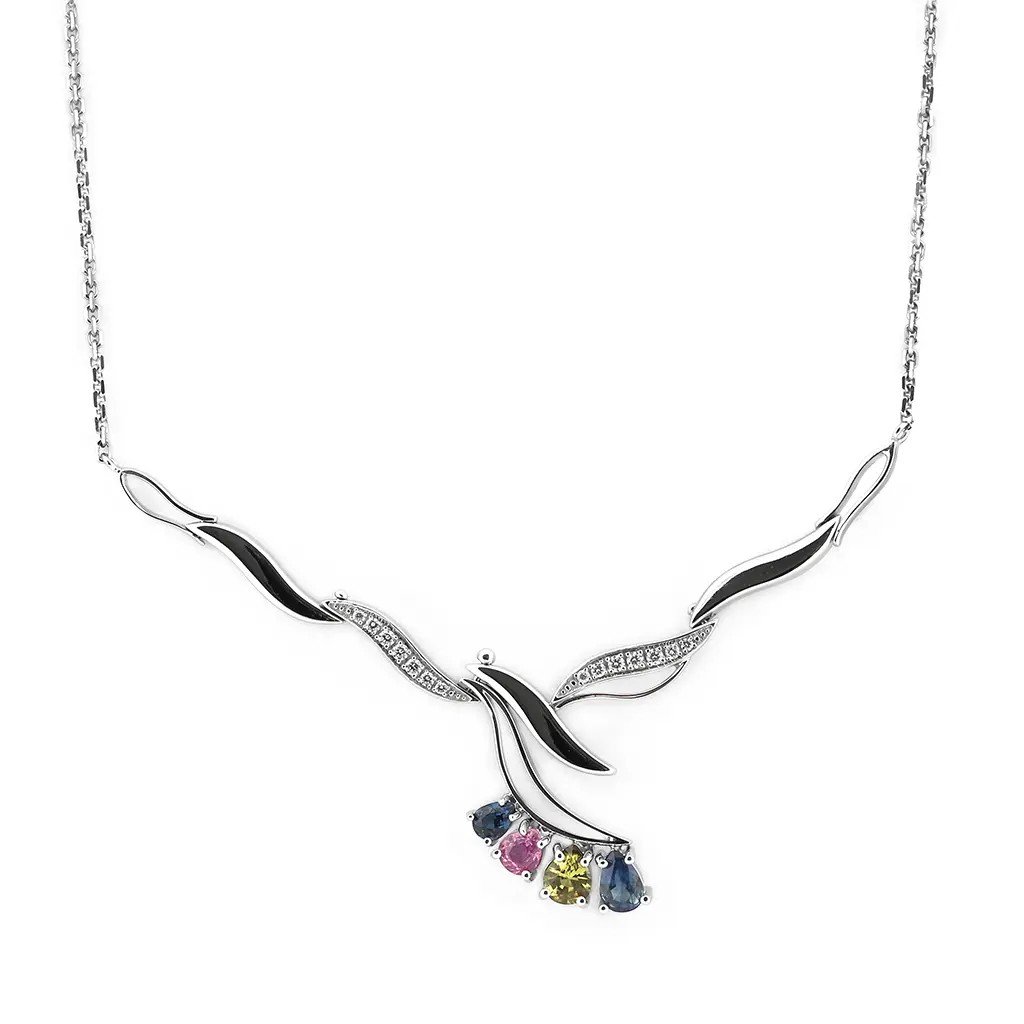 Tento ručně vyrobený náhrdelník z 14karátového bílého zlata (Au 585/1000, 9,40 g) spojuje precizní řemeslnou práci s luxusními přírodními kameny. Šperk je osazen čtyřmi pantlok fasetovanými safíry různých barev – modrý, růžový a nažloutle zelený (celkem 1,814 ct) a doplněn čtrnácti kulatými bílými diamanty G-H, VS-SI1 (celkem 0,166 ct, Ø 1,2–1,6 mm), které dodávají šperku třpytivý efekt.