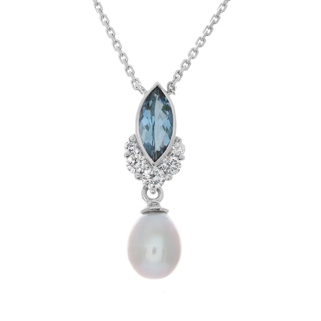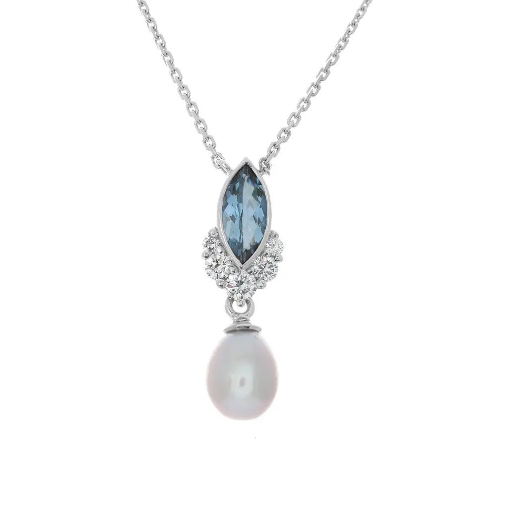 Tento ručně vyrobený náhrdelník z bílého zlata vyniká precizním zpracováním a jedinečnou kombinací drahých kamenů. Dominantou je kapkovitá sladkovodní perla o velikosti 9,1 × 7,0 mm a hmotnosti 3,089 ct, jejíž elegantní šedý odstín byl získán dodatečnou úpravou barvy. Perlou doplňuje přírodní tanzanit v markýzovém fasetovaném brusu s rozměry 10,15 × 5,0 × 3,05 mm a hmotností 1,055 ct. Jeho jemně nazelenale modrá barva dodává šperku hloubku a kouzelný nádech.
