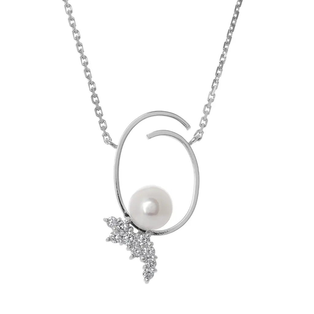 Ručně vyrobený náhrdelník z bílého zlata se sladkovodní perlou a devíti třpytivými diamanty. Jemný, nadčasový a luxusní šperk, který okamžitě upoutá pozornost.