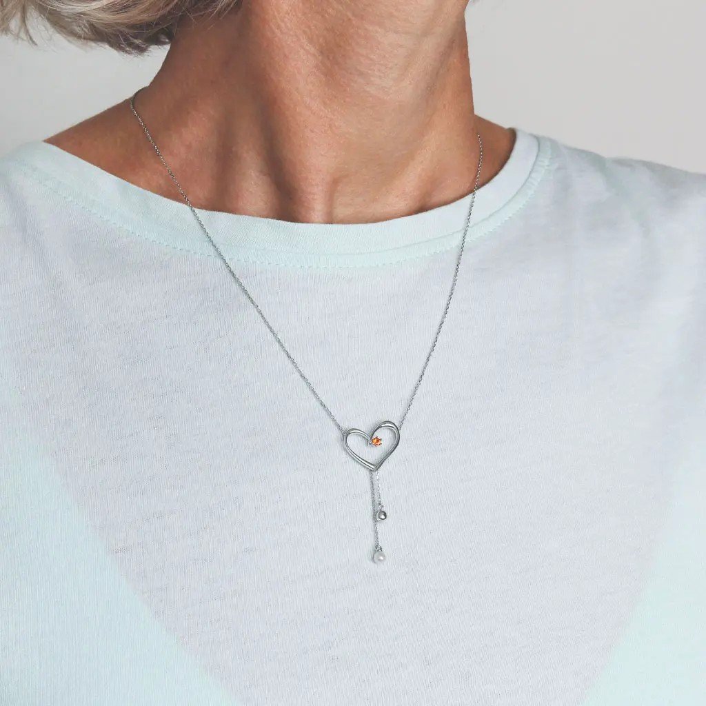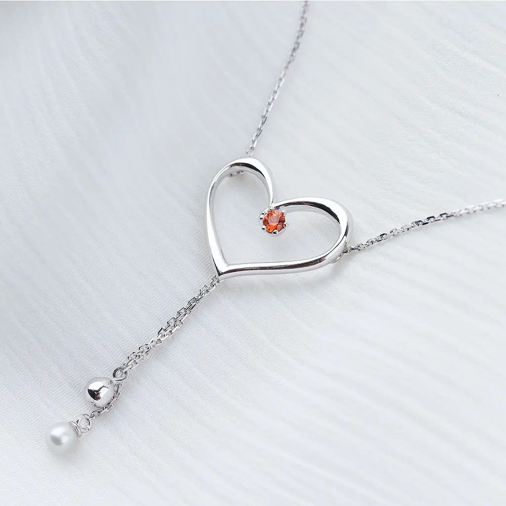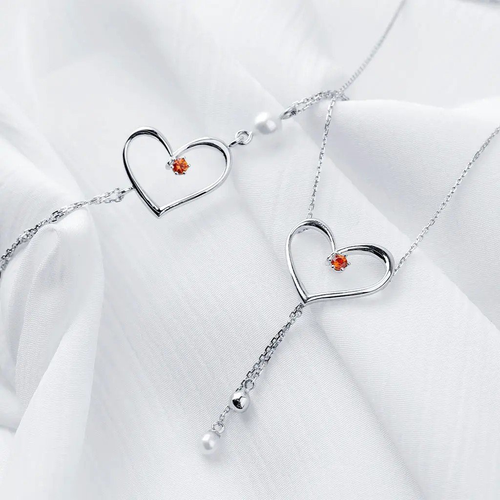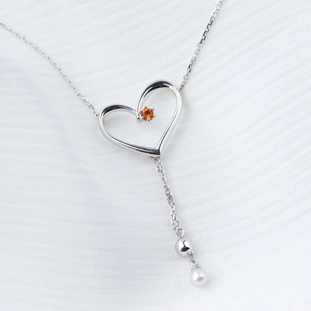 Romantický ručně vyrobený náhrdelník z bílého zlata se sladkovodní perlou a kulatým oranžovým safírem ve středu srdce. Jemný a osobitý šperk, který lze doplnit náramkem do elegantního setu.