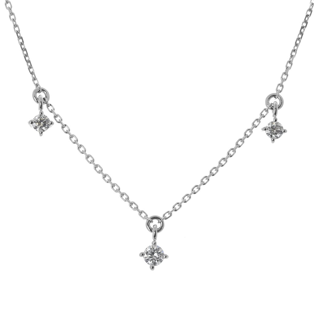 Jemný náhrdelník z bílého zlata 585/1000 zdobený třemi přírodními diamanty v briliantovém brusu. Elegantní, nadčasový a dokonale třpytivý šperk pro každodenní i slavnostní nošení.