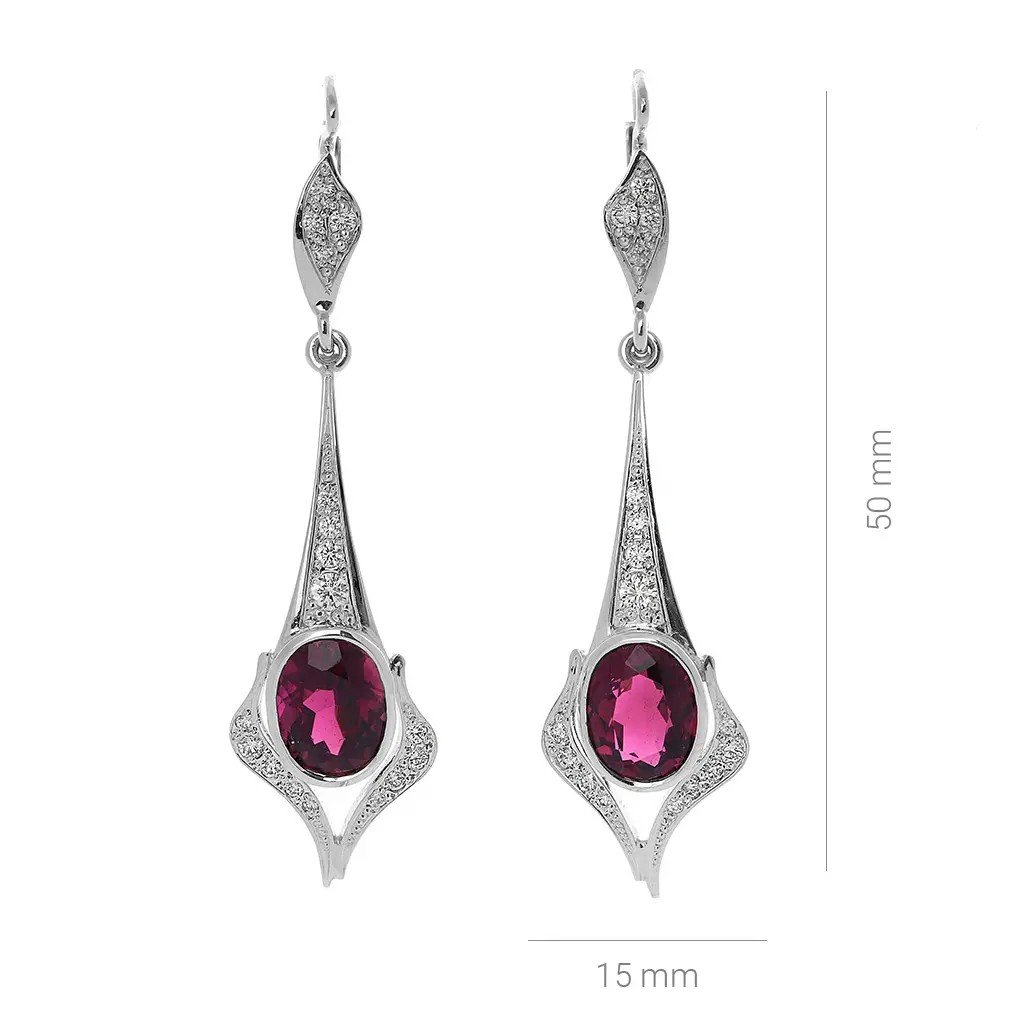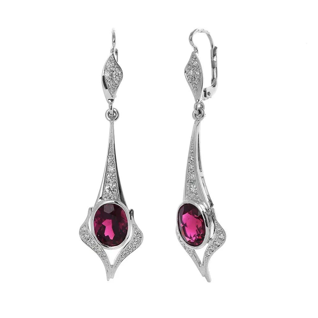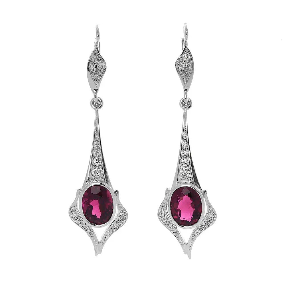 Výrazné náušnice z bílého zlata s purpurovými turmalíny a diamanty v jedinečném stylu art deco. Luxusní šperk pro mimořádné chvíle.