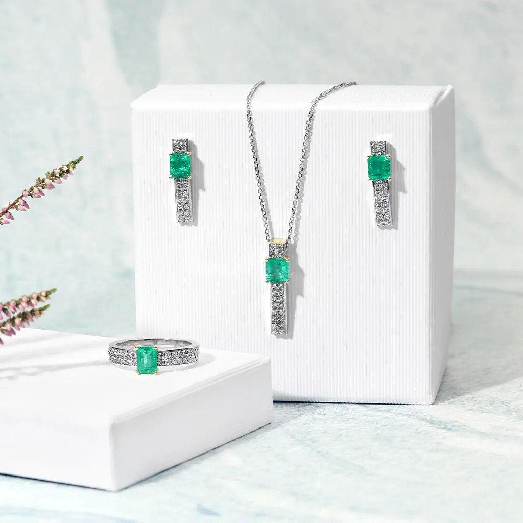 Každá náušnice je osazena dvěma tuporohými obdélníkovými smaragdy o rozměru 6×5 mm a celkové hmotnosti 1,658 ct. Jejich lehce namodrale zelená, transparentní barva s jemnou úpravou výplní fisur (F1–F2) připomíná zahradu v ranním světle a dodává šperku hloubku a sofistikovanost. Smaragdy pocházejí z Kolumbie a představují vrcholnou kvalitu a výjimečnost.