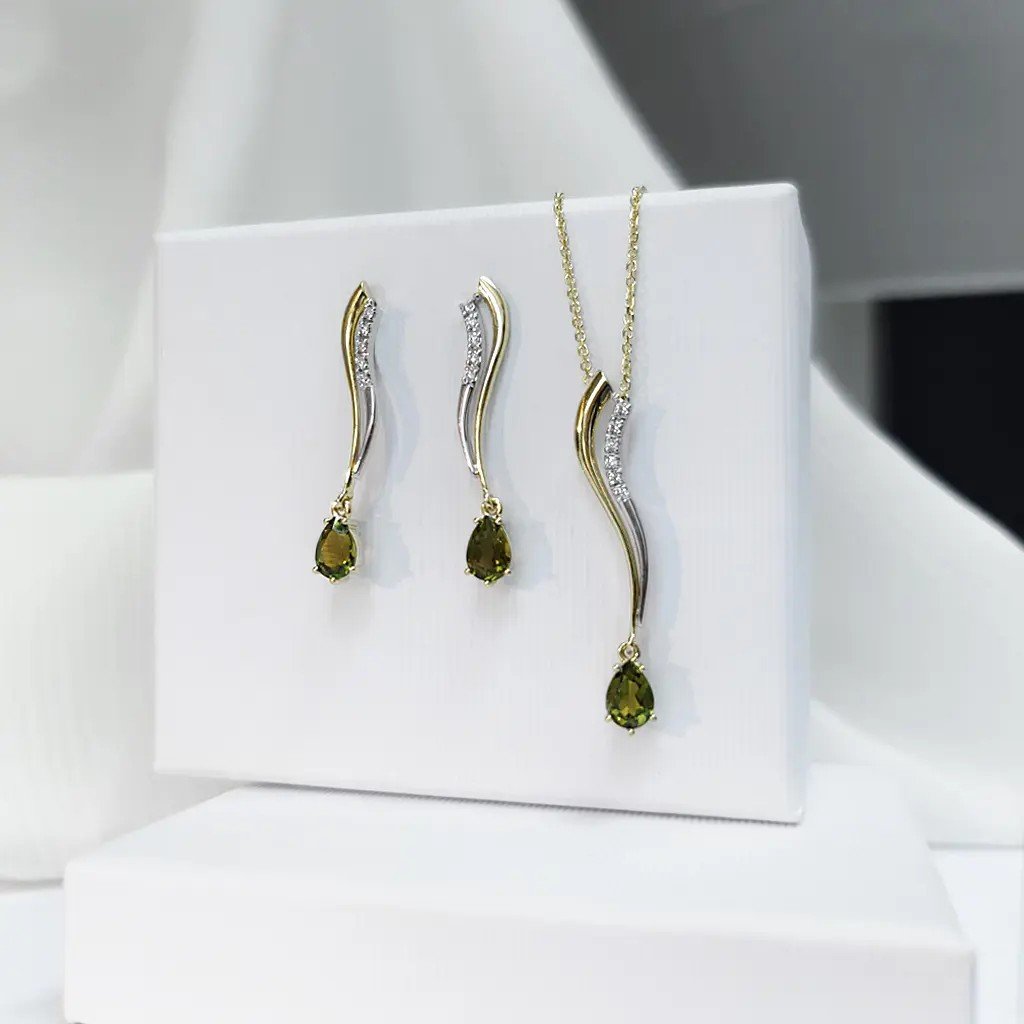 Ponořte se do světa jemného luxusu s tímto ručně vyrobeným párem náušnic z kombinace bílého a žlutého zlata Au 585/1000 o čisté hmotnosti 3,29 g. Každá náušnice je osazena dvěma zelenými turmalíny pantlok fasetovaného brusu o rozměru 7×5 mm a celkové hmotnosti 1,476 ct. Jejich svěží zelená barva připomíná první jarní listy zalité ranním sluncem a dodává šperku živost a charakter.