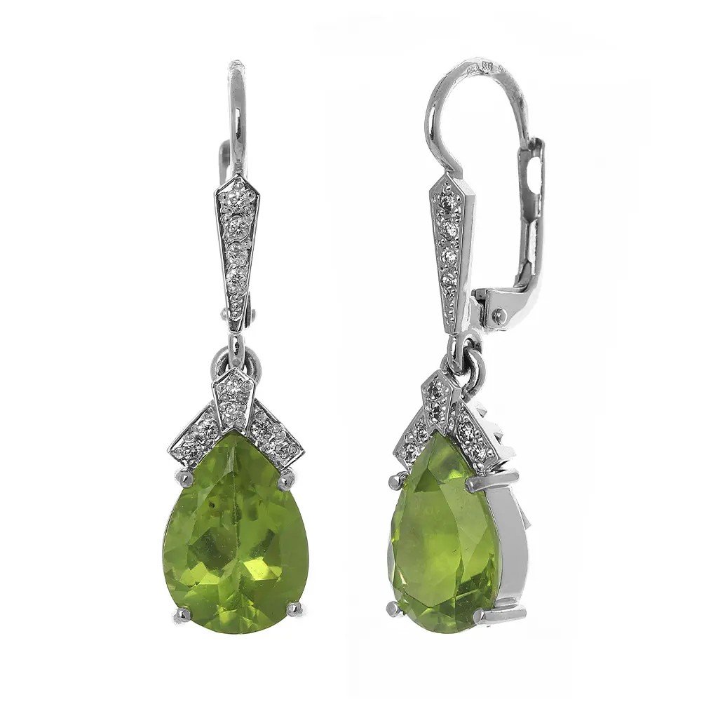 Náušnice z bílého zlata s olivíny a diamanty