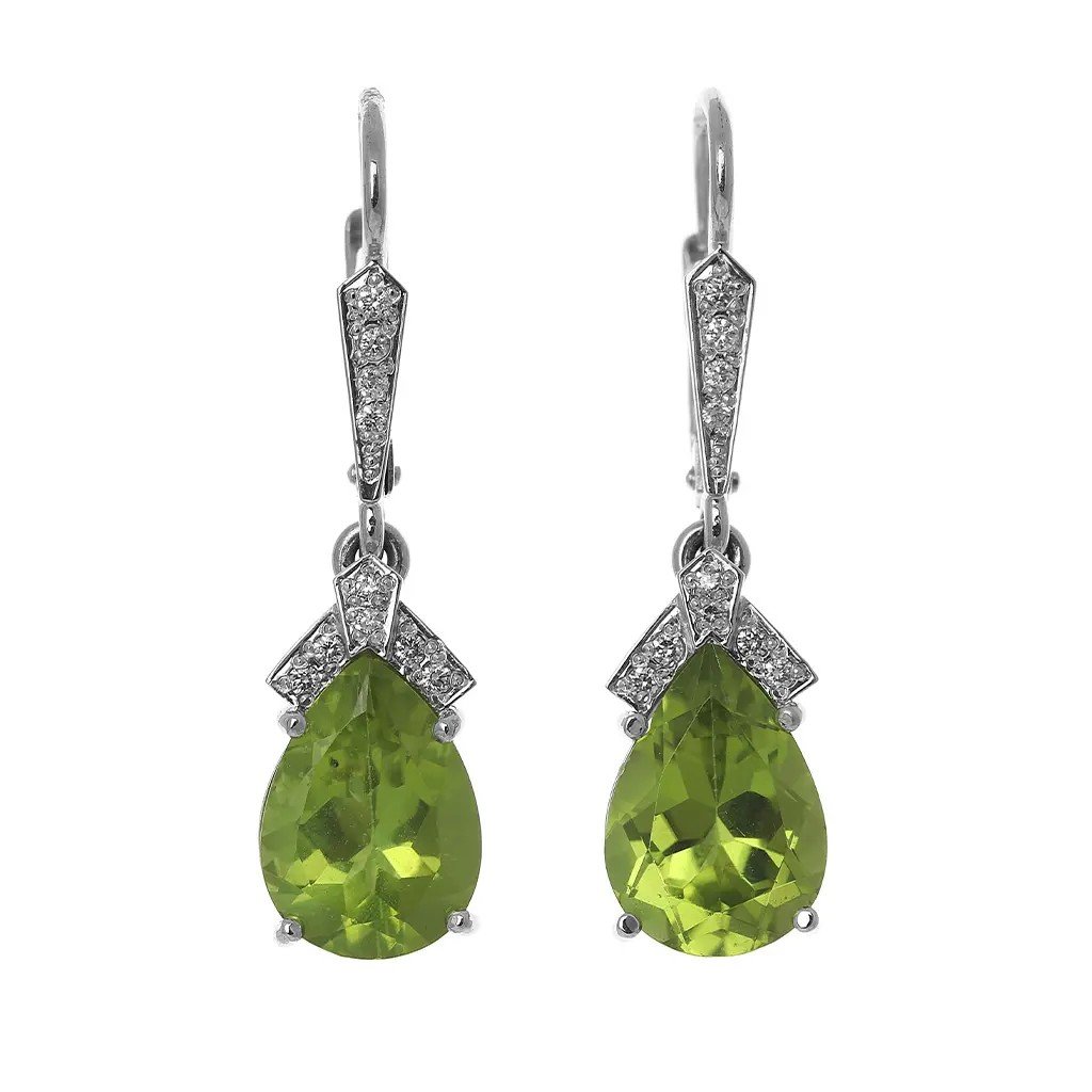 Náušnice z bílého zlata s olivíny a diamanty – zářivý šperk plný svěžesti a elegance.