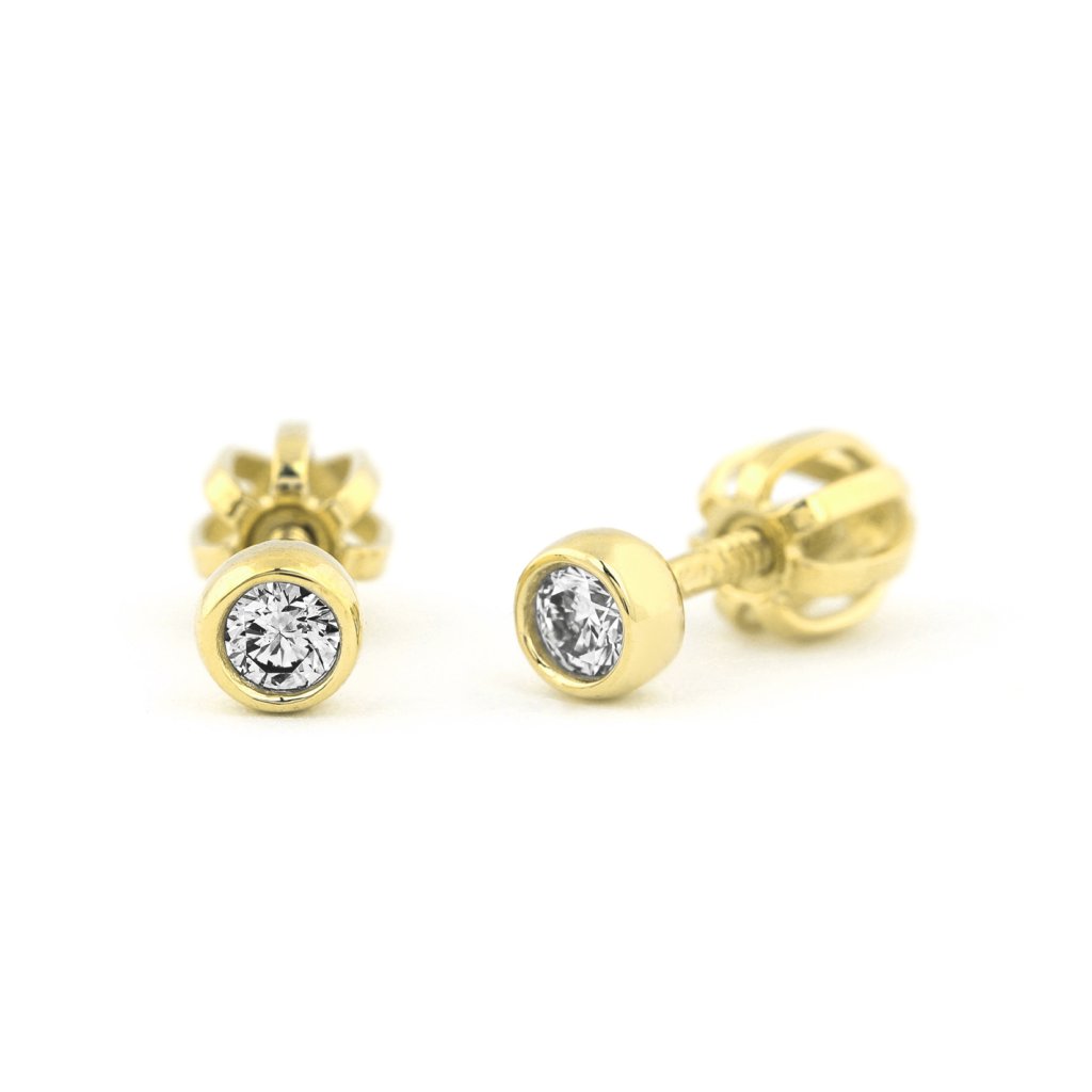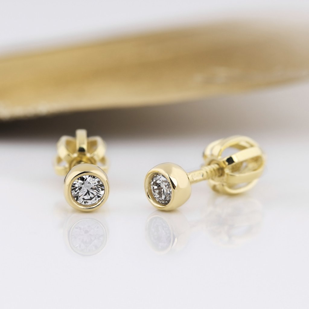 Jemné náušnice ze žlutého zlata s kulatými brilianty v elegantním hladkém osazení. Nadčasová čistota, jemný třpyt a dokonale univerzální elegance.