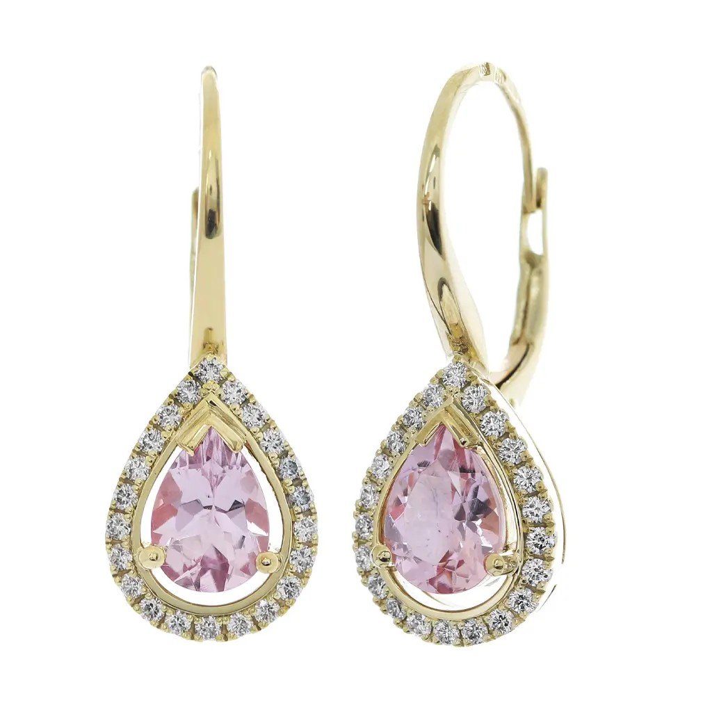 Jemné náušnice ze žlutého zlata s růžovým morganitem a diamanty. Nadčasový luxus a romantický třpyt pro každý okamžik.