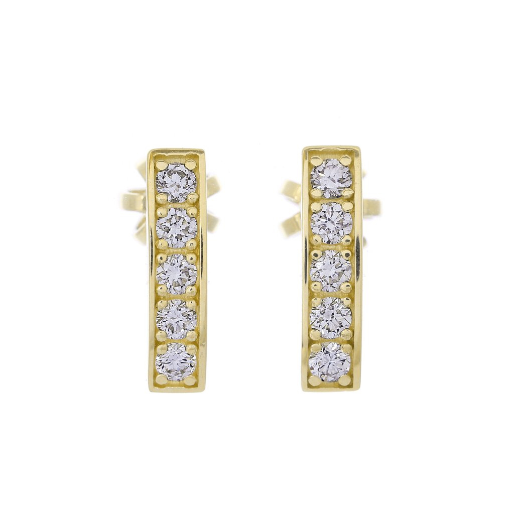 Jemné náušnice ze žlutého zlata 585/1000 zdobené deseti přírodními diamanty v briliantovém brusu. Elegantní, nadčasový a třpytivý šperk pro každý den.